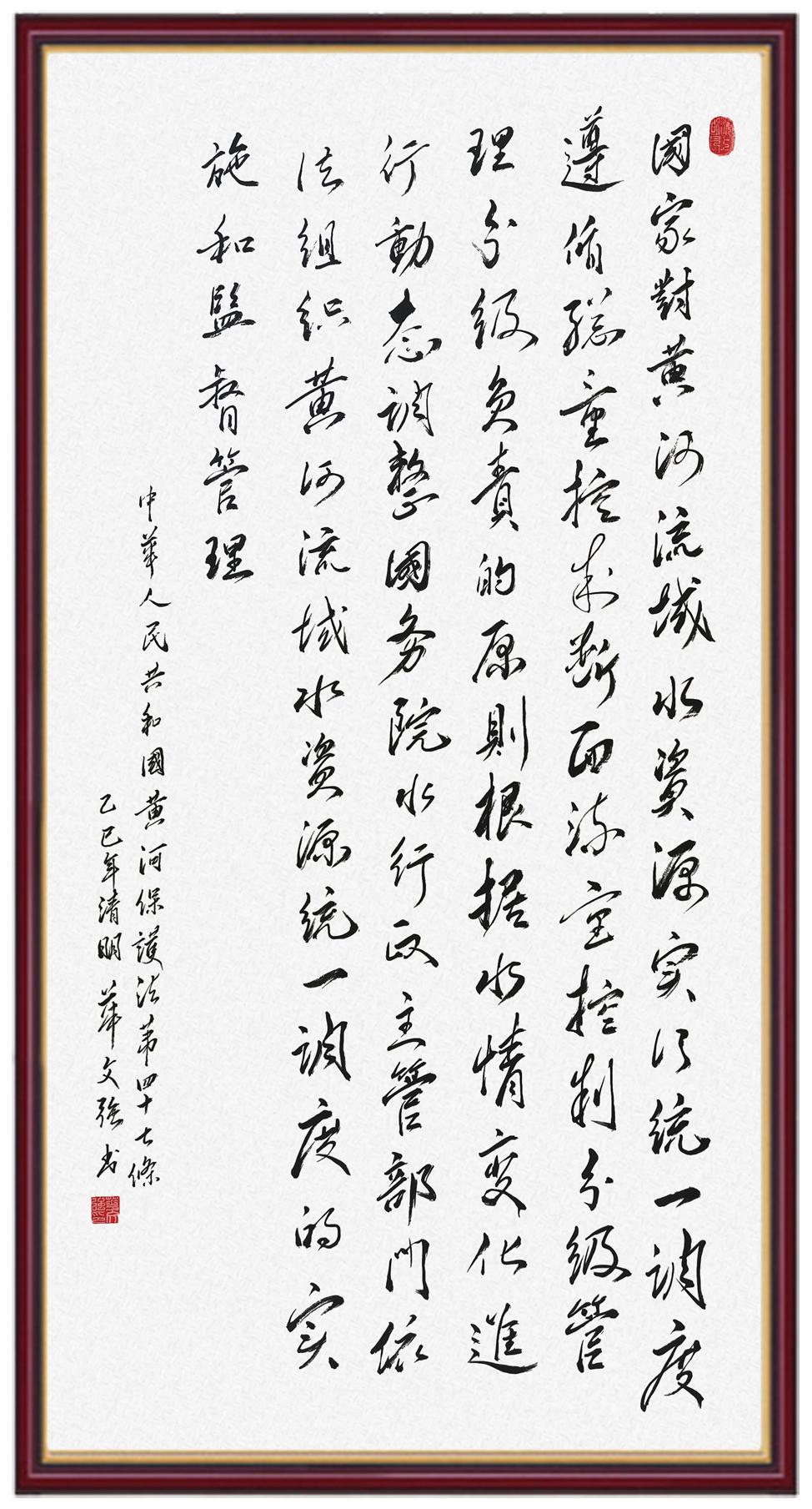 黃河寧,天下平。黃河是中華民族的發(fā)源地和搖籃,保護黃河是事關中華民族偉大復興的千秋大計。《中華人民共和國黃河保護法》為推進水資源節(jié)約集約利用、保護傳承弘揚黃河文化、推動黃河流域生態(tài)保護和高質量發(fā)展提供了有力法治保障。繼書寫《中華人民共和國民法典》《中華人民共和國憲法》《中華人民共和國澳門特別行政區(qū)基本法》《中華人民共和國香港特別行政區(qū)基本法》《中華人民共和國國旗法》《中華人民共和國國徽法》《中華人民共和國國歌法》《中華人民共和國法官法》等法律法規(guī)之后,法制日報社聯(lián)合沿黃九?。▍^(qū))司法廳、書法家協(xié)會,將筆端對準《中華人民共和國黃河保護法》。