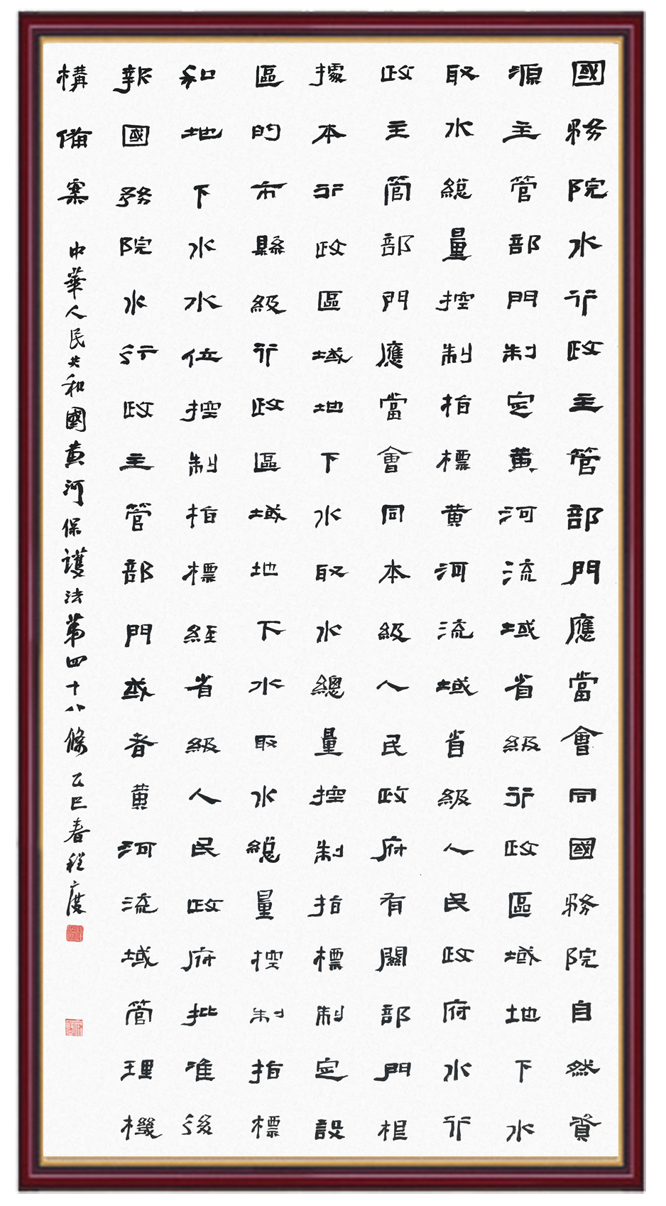 黃河寧,天下平。黃河是中華民族的發(fā)源地和搖籃,保護(hù)黃河是事關(guān)中華民族偉大復(fù)興的千秋大計(jì)。《中華人民共和國(guó)黃河保護(hù)法》為推進(jìn)水資源節(jié)約集約利用、保護(hù)傳承弘揚(yáng)黃河文化、推動(dòng)黃河流域生態(tài)保護(hù)和高質(zhì)量發(fā)展提供了有力法治保障。繼書寫《中華人民共和國(guó)民法典》《中華人民共和國(guó)憲法》《中華人民共和國(guó)澳門特別行政區(qū)基本法》《中華人民共和國(guó)香港特別行政區(qū)基本法》《中華人民共和國(guó)國(guó)旗法》《中華人民共和國(guó)國(guó)徽法》《中華人民共和國(guó)國(guó)歌法》《中華人民共和國(guó)法官法》等法律法規(guī)之后,法制日?qǐng)?bào)社聯(lián)合沿黃九省(區(qū))司法廳、書法家協(xié)會(huì),將筆端對(duì)準(zhǔn)《中華人民共和國(guó)黃河保護(hù)法》。