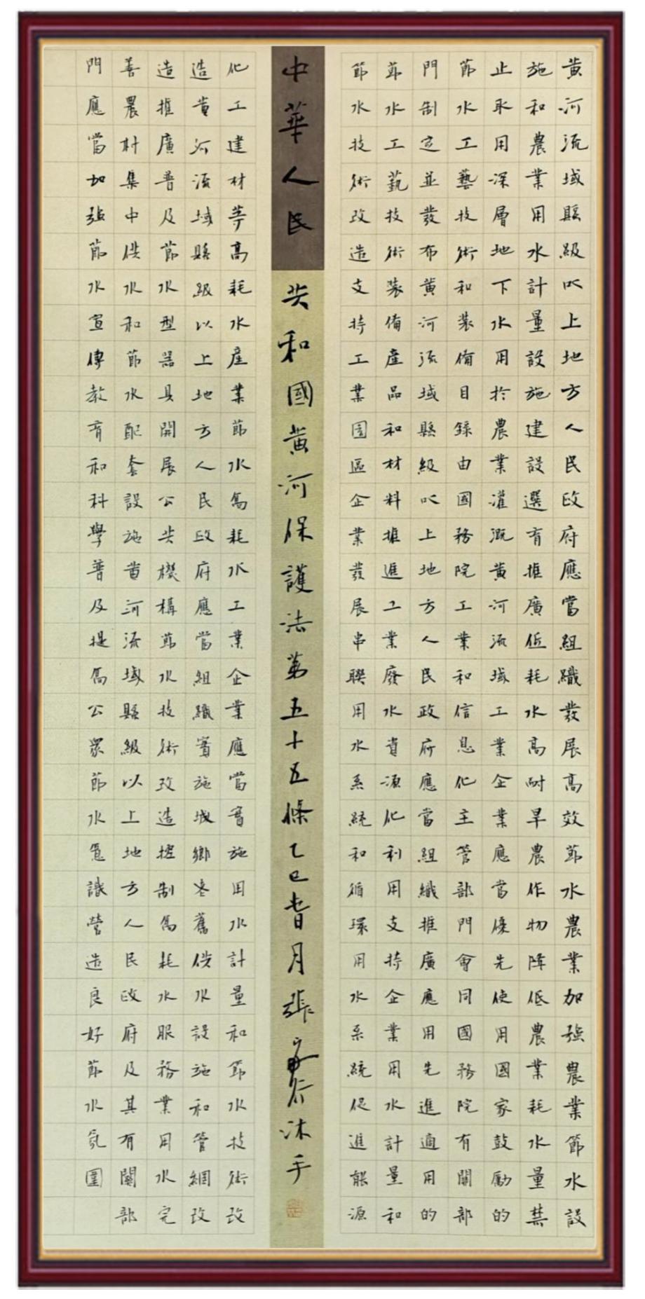 黃河寧,天下平。黃河是中華民族的發(fā)源地和搖籃,保護(hù)黃河是事關(guān)中華民族偉大復(fù)興的千秋大計(jì)?!吨腥A人民共和國(guó)黃河保護(hù)法》為推進(jìn)水資源節(jié)約集約利用、保護(hù)傳承弘揚(yáng)黃河文化、推動(dòng)黃河流域生態(tài)保護(hù)和高質(zhì)量發(fā)展提供了有力法治保障。繼書(shū)寫(xiě)《中華人民共和國(guó)民法典》《中華人民共和國(guó)憲法》《中華人民共和國(guó)澳門特別行政區(qū)基本法》《中華人民共和國(guó)香港特別行政區(qū)基本法》《中華人民共和國(guó)國(guó)旗法》《中華人民共和國(guó)國(guó)徽法》《中華人民共和國(guó)國(guó)歌法》《中華人民共和國(guó)法官法》等法律法規(guī)之后,法制日?qǐng)?bào)社聯(lián)合沿黃九?。▍^(qū))司法廳、書(shū)法家協(xié)會(huì),將筆端對(duì)準(zhǔn)《中華人民共和國(guó)黃河保護(hù)法》。