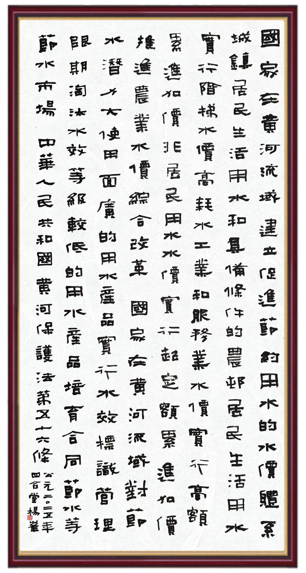 黃河寧,天下平。黃河是中華民族的發(fā)源地和搖籃,保護(hù)黃河是事關(guān)中華民族偉大復(fù)興的千秋大計。《中華人民共和國黃河保護(hù)法》為推進(jìn)水資源節(jié)約集約利用、保護(hù)傳承弘揚(yáng)黃河文化、推動黃河流域生態(tài)保護(hù)和高質(zhì)量發(fā)展提供了有力法治保障。繼書寫《中華人民共和國民法典》《中華人民共和國憲法》《中華人民共和國澳門特別行政區(qū)基本法》《中華人民共和國香港特別行政區(qū)基本法》《中華人民共和國國旗法》《中華人民共和國國徽法》《中華人民共和國國歌法》《中華人民共和國法官法》等法律法規(guī)之后,法制日報社聯(lián)合沿黃九省(區(qū))司法廳、書法家協(xié)會,將筆端對準(zhǔn)《中華人民共和國黃河保護(hù)法》。