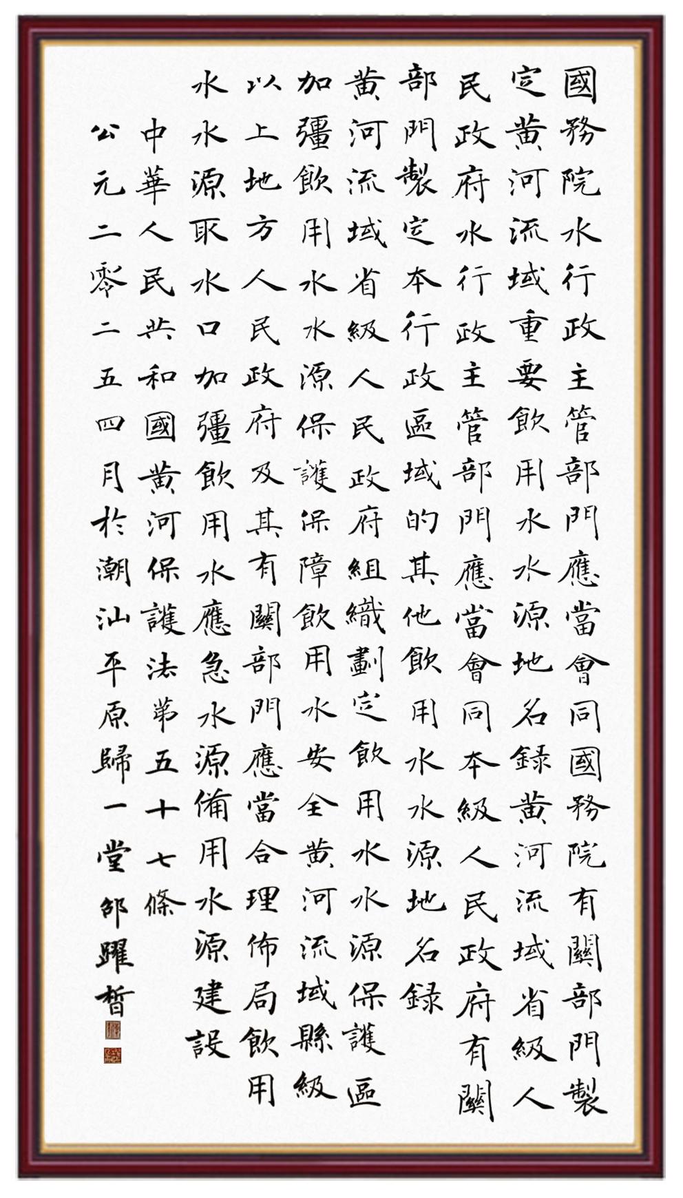 黃河寧,天下平。黃河是中華民族的發(fā)源地和搖籃,保護黃河是事關(guān)中華民族偉大復(fù)興的千秋大計?!吨腥A人民共和國黃河保護法》為推進水資源節(jié)約集約利用、保護傳承弘揚黃河文化、推動黃河流域生態(tài)保護和高質(zhì)量發(fā)展提供了有力法治保障。繼書寫《中華人民共和國民法典》《中華人民共和國憲法》《中華人民共和國澳門特別行政區(qū)基本法》《中華人民共和國香港特別行政區(qū)基本法》《中華人民共和國國旗法》《中華人民共和國國徽法》《中華人民共和國國歌法》《中華人民共和國法官法》等法律法規(guī)之后,法制日報社聯(lián)合沿黃九省(區(qū))司法廳、書法家協(xié)會,將筆端對準《中華人民共和國黃河保護法》。