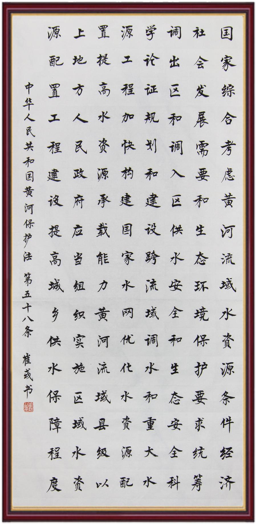 黃河寧,天下平。黃河是中華民族的發(fā)源地和搖籃,保護(hù)黃河是事關(guān)中華民族偉大復(fù)興的千秋大計(jì)?!吨腥A人民共和國黃河保護(hù)法》為推進(jìn)水資源節(jié)約集約利用、保護(hù)傳承弘揚(yáng)黃河文化、推動(dòng)黃河流域生態(tài)保護(hù)和高質(zhì)量發(fā)展提供了有力法治保障。繼書寫《中華人民共和國民法典》《中華人民共和國憲法》《中華人民共和國澳門特別行政區(qū)基本法》《中華人民共和國香港特別行政區(qū)基本法》《中華人民共和國國旗法》《中華人民共和國國徽法》《中華人民共和國國歌法》《中華人民共和國法官法》等法律法規(guī)之后,法制日報(bào)社聯(lián)合沿黃九?。▍^(qū))司法廳、書法家協(xié)會,將筆端對準(zhǔn)《中華人民共和國黃河保護(hù)法》。
