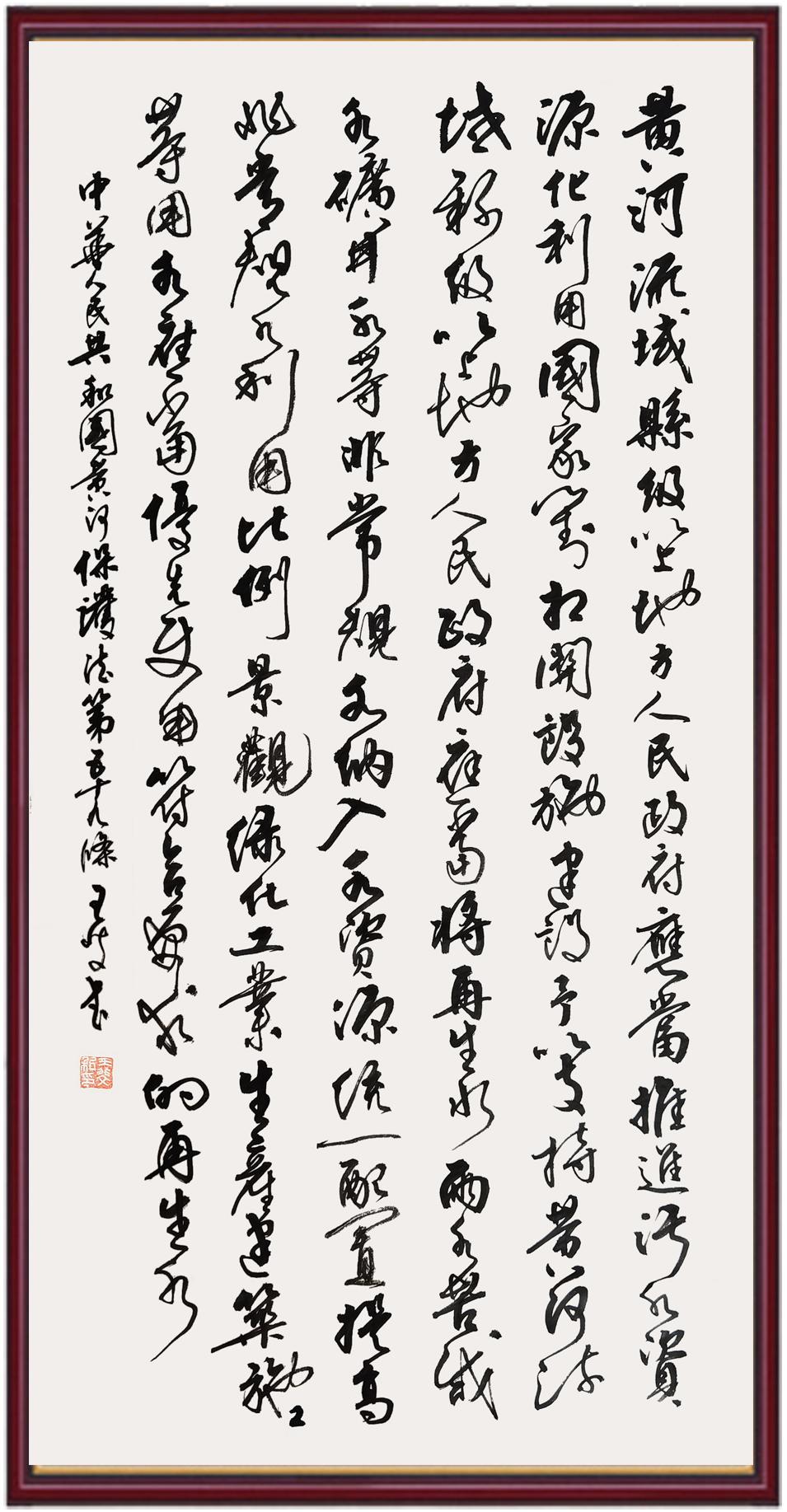 黃河寧,天下平。黃河是中華民族的發(fā)源地和搖籃,保護(hù)黃河是事關(guān)中華民族偉大復(fù)興的千秋大計?!吨腥A人民共和國黃河保護(hù)法》為推進(jìn)水資源節(jié)約集約利用、保護(hù)傳承弘揚黃河文化、推動黃河流域生態(tài)保護(hù)和高質(zhì)量發(fā)展提供了有力法治保障。繼書寫《中華人民共和國民法典》《中華人民共和國憲法》《中華人民共和國澳門特別行政區(qū)基本法》《中華人民共和國香港特別行政區(qū)基本法》《中華人民共和國國旗法》《中華人民共和國國徽法》《中華人民共和國國歌法》《中華人民共和國法官法》等法律法規(guī)之后,法制日報社聯(lián)合沿黃九?。▍^(qū))司法廳、書法家協(xié)會,將筆端對準(zhǔn)《中華人民共和國黃河保護(hù)法》。