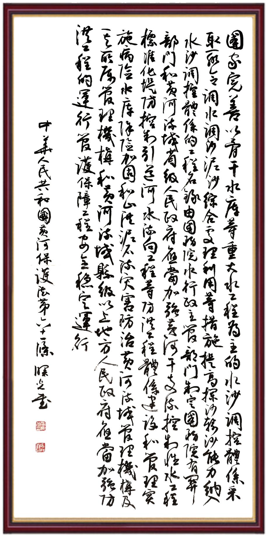黃河寧,天下平。黃河是中華民族的發(fā)源地和搖籃,保護(hù)黃河是事關(guān)中華民族偉大復(fù)興的千秋大計(jì)。《中華人民共和國黃河保護(hù)法》為推進(jìn)水資源節(jié)約集約利用、保護(hù)傳承弘揚(yáng)黃河文化、推動(dòng)黃河流域生態(tài)保護(hù)和高質(zhì)量發(fā)展提供了有力法治保障。繼書寫《中華人民共和國民法典》《中華人民共和國憲法》《中華人民共和國澳門特別行政區(qū)基本法》《中華人民共和國香港特別行政區(qū)基本法》《中華人民共和國國旗法》《中華人民共和國國徽法》《中華人民共和國國歌法》《中華人民共和國法官法》等法律法規(guī)之后,法制日報(bào)社聯(lián)合沿黃九?。▍^(qū))司法廳、書法家協(xié)會(huì),將筆端對準(zhǔn)《中華人民共和國黃河保護(hù)法》。