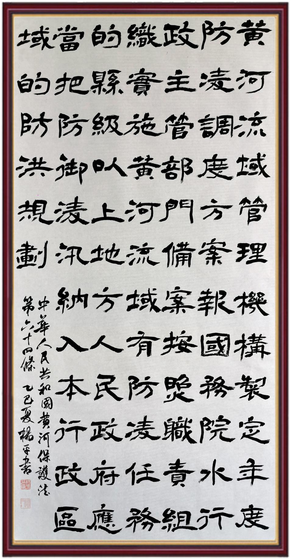 黃河寧,天下平。黃河是中華民族的發(fā)源地和搖籃,保護(hù)黃河是事關(guān)中華民族偉大復(fù)興的千秋大計?!吨腥A人民共和國黃河保護(hù)法》為推進(jìn)水資源節(jié)約集約利用、保護(hù)傳承弘揚黃河文化、推動黃河流域生態(tài)保護(hù)和高質(zhì)量發(fā)展提供了有力法治保障。繼書寫《中華人民共和國民法典》《中華人民共和國憲法》《中華人民共和國澳門特別行政區(qū)基本法》《中華人民共和國香港特別行政區(qū)基本法》《中華人民共和國國旗法》《中華人民共和國國徽法》《中華人民共和國國歌法》《中華人民共和國法官法》等法律法規(guī)之后,法制日報社聯(lián)合沿黃九?。▍^(qū))司法廳、書法家協(xié)會,將筆端對準(zhǔn)《中華人民共和國黃河保護(hù)法》。