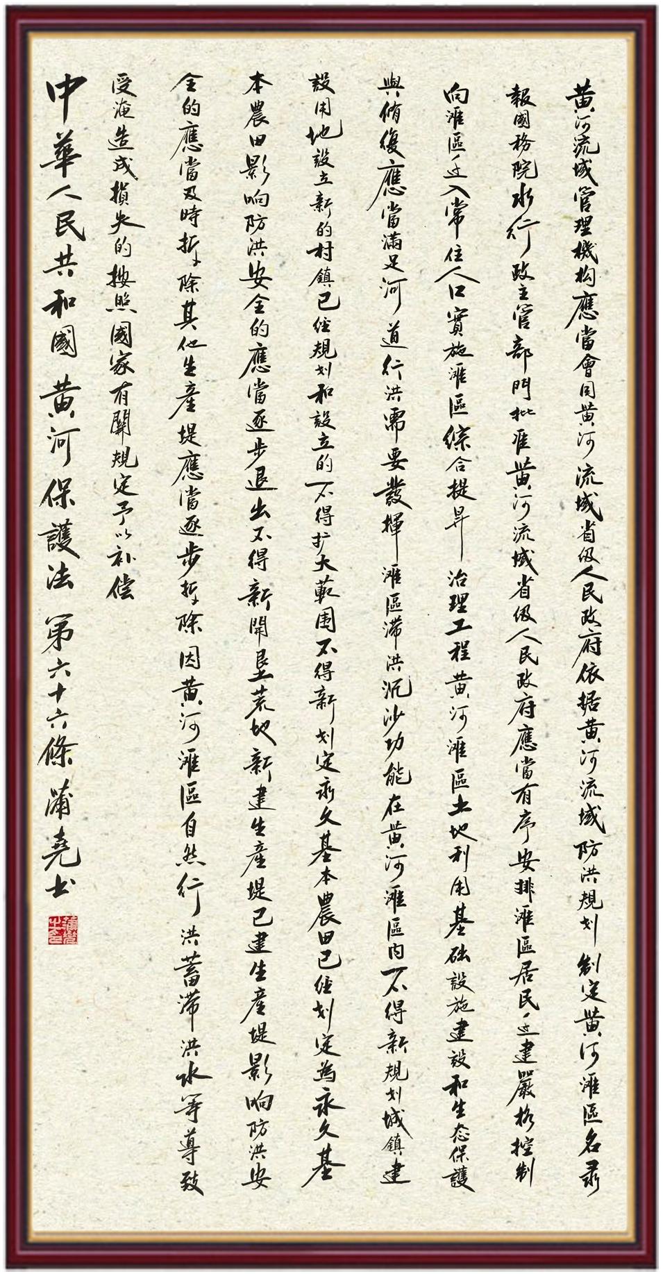 黃河寧,天下平。黃河是中華民族的發(fā)源地和搖籃,保護(hù)黃河是事關(guān)中華民族偉大復(fù)興的千秋大計(jì)?!吨腥A人民共和國(guó)黃河保護(hù)法》為推進(jìn)水資源節(jié)約集約利用、保護(hù)傳承弘揚(yáng)黃河文化、推動(dòng)黃河流域生態(tài)保護(hù)和高質(zhì)量發(fā)展提供了有力法治保障。繼書寫《中華人民共和國(guó)民法典》《中華人民共和國(guó)憲法》《中華人民共和國(guó)澳門特別行政區(qū)基本法》《中華人民共和國(guó)香港特別行政區(qū)基本法》《中華人民共和國(guó)國(guó)旗法》《中華人民共和國(guó)國(guó)徽法》《中華人民共和國(guó)國(guó)歌法》《中華人民共和國(guó)法官法》等法律法規(guī)之后,法制日?qǐng)?bào)社聯(lián)合沿黃九省(區(qū))司法廳、書法家協(xié)會(huì),將筆端對(duì)準(zhǔn)《中華人民共和國(guó)黃河保護(hù)法》。