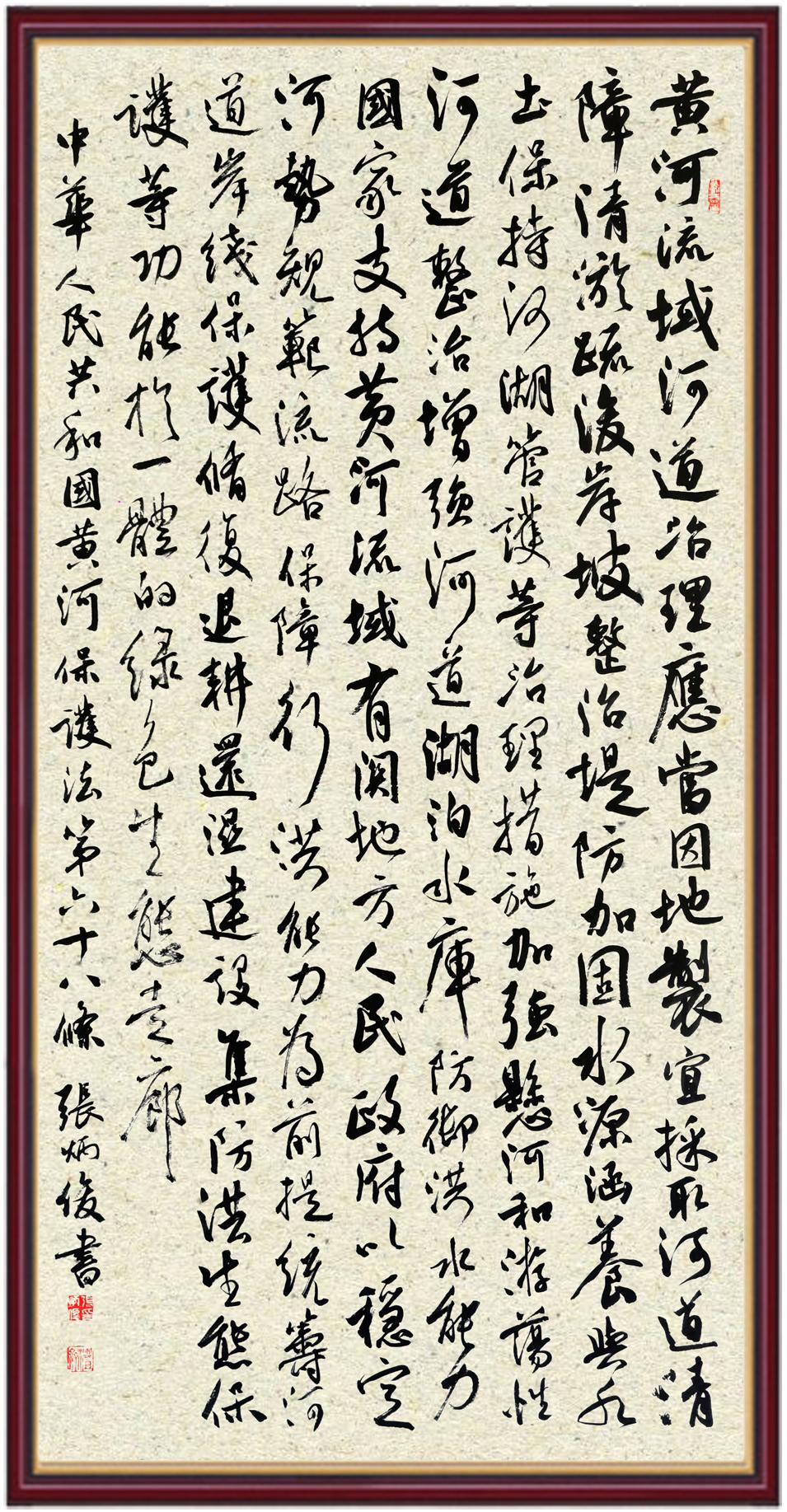 黃河寧,天下平。黃河是中華民族的發(fā)源地和搖籃,保護黃河是事關中華民族偉大復興的千秋大計?!吨腥A人民共和國黃河保護法》為推進水資源節(jié)約集約利用、保護傳承弘揚黃河文化、推動黃河流域生態(tài)保護和高質(zhì)量發(fā)展提供了有力法治保障。繼書寫《中華人民共和國民法典》《中華人民共和國憲法》《中華人民共和國澳門特別行政區(qū)基本法》《中華人民共和國香港特別行政區(qū)基本法》《中華人民共和國國旗法》《中華人民共和國國徽法》《中華人民共和國國歌法》《中華人民共和國法官法》等法律法規(guī)之后,法制日報社聯(lián)合沿黃九省(區(qū))司法廳、書法家協(xié)會,將筆端對準《中華人民共和國黃河保護法》。