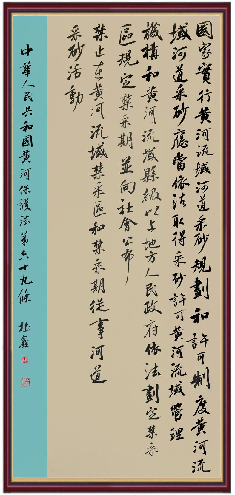 黃河寧,天下平。黃河是中華民族的發(fā)源地和搖籃,保護(hù)黃河是事關(guān)中華民族偉大復(fù)興的千秋大計?!吨腥A人民共和國黃河保護(hù)法》為推進(jìn)水資源節(jié)約集約利用、保護(hù)傳承弘揚黃河文化、推動黃河流域生態(tài)保護(hù)和高質(zhì)量發(fā)展提供了有力法治保障。繼書寫《中華人民共和國民法典》《中華人民共和國憲法》《中華人民共和國澳門特別行政區(qū)基本法》《中華人民共和國香港特別行政區(qū)基本法》《中華人民共和國國旗法》《中華人民共和國國徽法》《中華人民共和國國歌法》《中華人民共和國法官法》等法律法規(guī)之后,法制日報社聯(lián)合沿黃九?。▍^(qū))司法廳、書法家協(xié)會,將筆端對準(zhǔn)《中華人民共和國黃河保護(hù)法》。