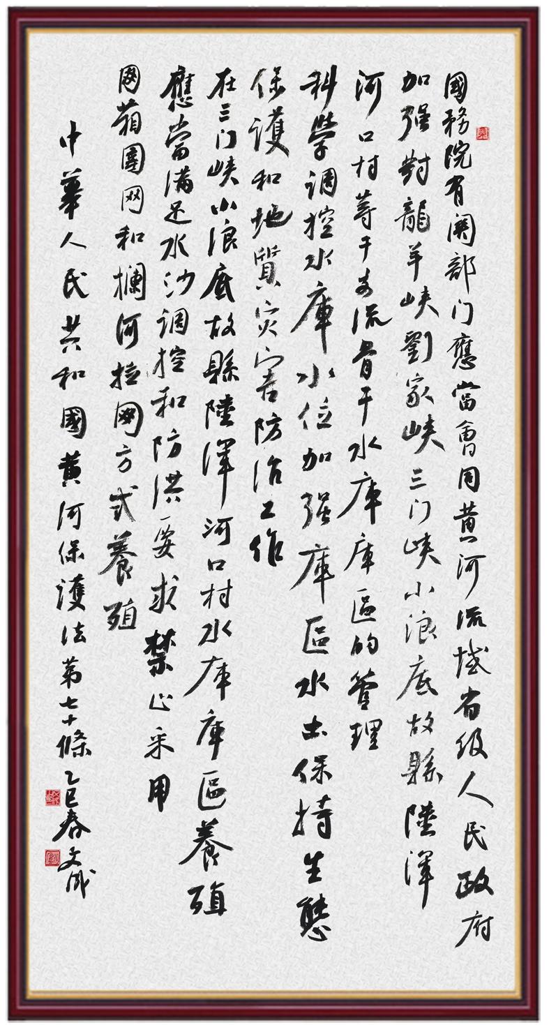 黃河寧,天下平。黃河是中華民族的發(fā)源地和搖籃,保護黃河是事關(guān)中華民族偉大復(fù)興的千秋大計。《中華人民共和國黃河保護法》為推進水資源節(jié)約集約利用、保護傳承弘揚黃河文化、推動黃河流域生態(tài)保護和高質(zhì)量發(fā)展提供了有力法治保障。繼書寫《中華人民共和國民法典》《中華人民共和國憲法》《中華人民共和國澳門特別行政區(qū)基本法》《中華人民共和國香港特別行政區(qū)基本法》《中華人民共和國國旗法》《中華人民共和國國徽法》《中華人民共和國國歌法》《中華人民共和國法官法》等法律法規(guī)之后,法制日報社聯(lián)合沿黃九?。▍^(qū))司法廳、書法家協(xié)會,將筆端對準(zhǔn)《中華人民共和國黃河保護法》。