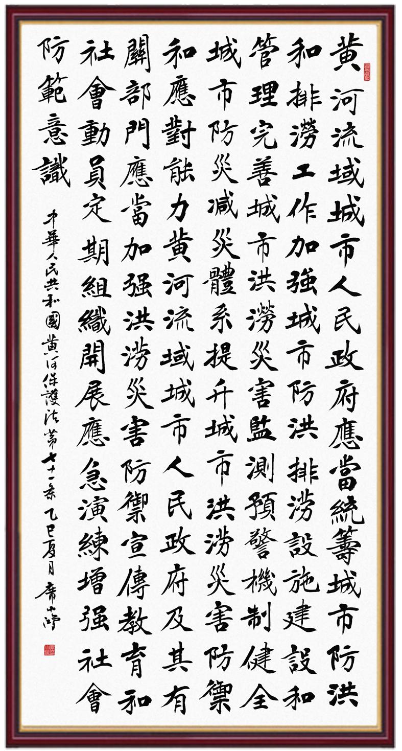 黃河寧,天下平。黃河是中華民族的發(fā)源地和搖籃,保護(hù)黃河是事關(guān)中華民族偉大復(fù)興的千秋大計(jì)?!吨腥A人民共和國(guó)黃河保護(hù)法》為推進(jìn)水資源節(jié)約集約利用、保護(hù)傳承弘揚(yáng)黃河文化、推動(dòng)黃河流域生態(tài)保護(hù)和高質(zhì)量發(fā)展提供了有力法治保障。繼書寫《中華人民共和國(guó)民法典》《中華人民共和國(guó)憲法》《中華人民共和國(guó)澳門特別行政區(qū)基本法》《中華人民共和國(guó)香港特別行政區(qū)基本法》《中華人民共和國(guó)國(guó)旗法》《中華人民共和國(guó)國(guó)徽法》《中華人民共和國(guó)國(guó)歌法》《中華人民共和國(guó)法官法》等法律法規(guī)之后,法制日?qǐng)?bào)社聯(lián)合沿黃九省(區(qū))司法廳、書法家協(xié)會(huì),將筆端對(duì)準(zhǔn)《中華人民共和國(guó)黃河保護(hù)法》。