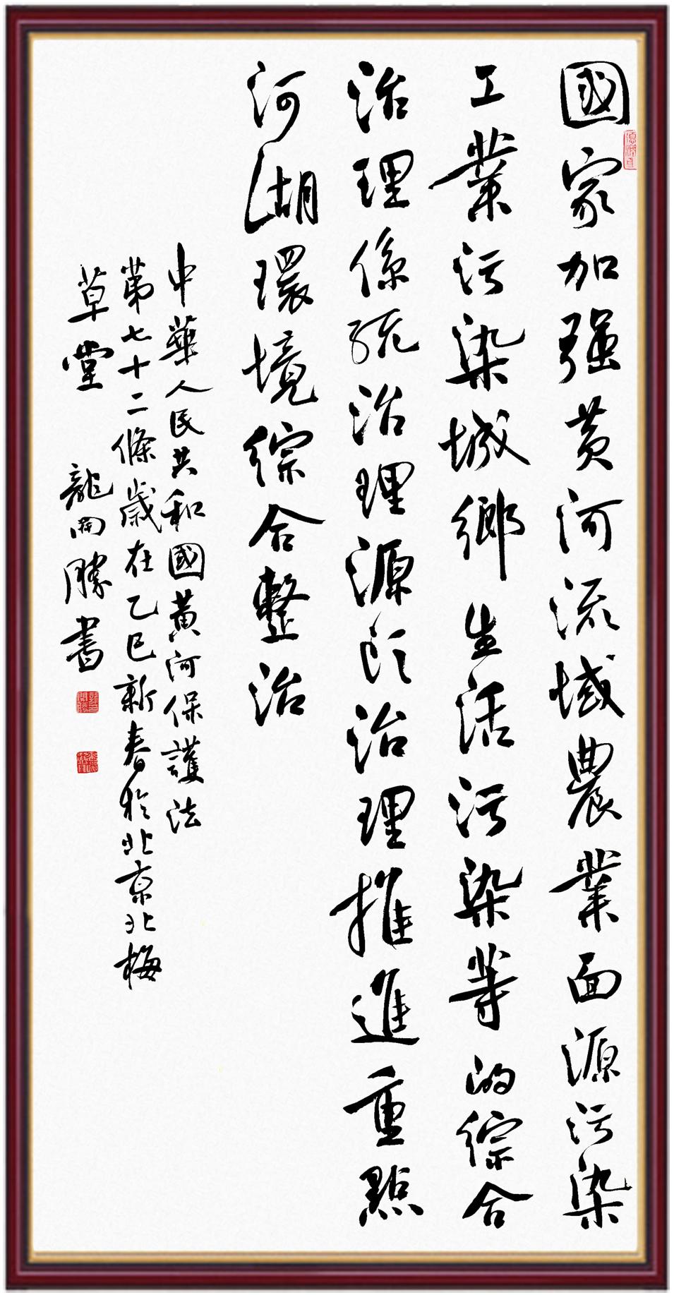 黃河寧,天下平。黃河是中華民族的發(fā)源地和搖籃,保護黃河是事關(guān)中華民族偉大復(fù)興的千秋大計。《中華人民共和國黃河保護法》為推進水資源節(jié)約集約利用、保護傳承弘揚黃河文化、推動黃河流域生態(tài)保護和高質(zhì)量發(fā)展提供了有力法治保障。繼書寫《中華人民共和國民法典》《中華人民共和國憲法》《中華人民共和國澳門特別行政區(qū)基本法》《中華人民共和國香港特別行政區(qū)基本法》《中華人民共和國國旗法》《中華人民共和國國徽法》《中華人民共和國國歌法》《中華人民共和國法官法》等法律法規(guī)之后,法制日報社聯(lián)合沿黃九省(區(qū))司法廳、書法家協(xié)會,將筆端對準《中華人民共和國黃河保護法》。