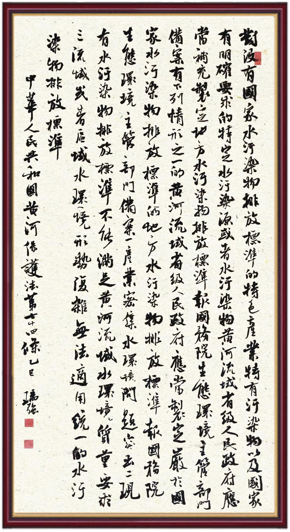 黃河寧,天下平。黃河是中華民族的發(fā)源地和搖籃,保護(hù)黃河是事關(guān)中華民族偉大復(fù)興的千秋大計(jì)。《中華人民共和國(guó)黃河保護(hù)法》為推進(jìn)水資源節(jié)約集約利用、保護(hù)傳承弘揚(yáng)黃河文化、推動(dòng)黃河流域生態(tài)保護(hù)和高質(zhì)量發(fā)展提供了有力法治保障。繼書(shū)寫(xiě)《中華人民共和國(guó)民法典》《中華人民共和國(guó)憲法》《中華人民共和國(guó)澳門(mén)特別行政區(qū)基本法》《中華人民共和國(guó)香港特別行政區(qū)基本法》《中華人民共和國(guó)國(guó)旗法》《中華人民共和國(guó)國(guó)徽法》《中華人民共和國(guó)國(guó)歌法》《中華人民共和國(guó)法官法》等法律法規(guī)之后,法制日?qǐng)?bào)社聯(lián)合沿黃九?。▍^(qū))司法廳、書(shū)法家協(xié)會(huì),將筆端對(duì)準(zhǔn)《中華人民共和國(guó)黃河保護(hù)法》。