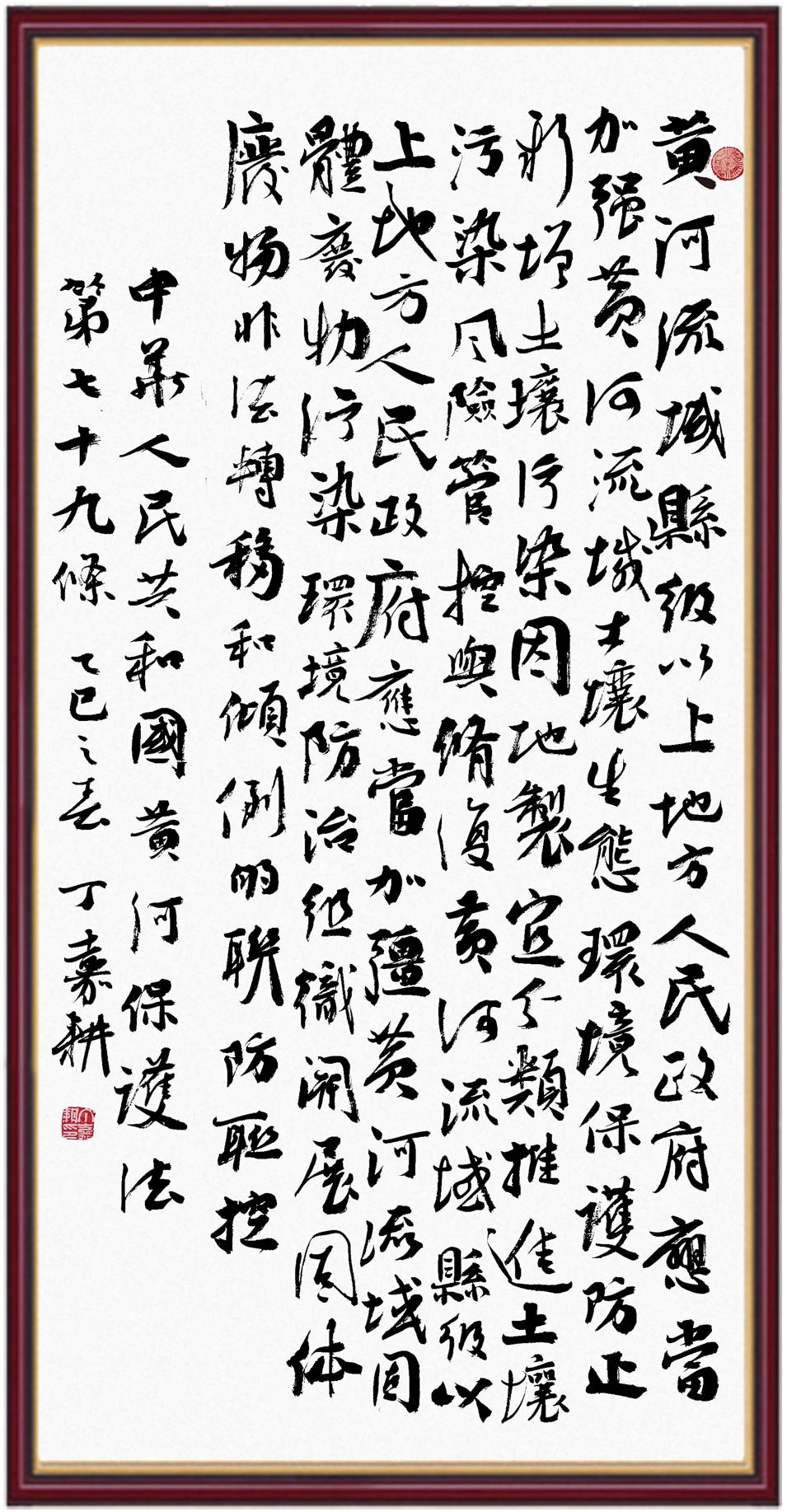 黃河寧,天下平。黃河是中華民族的發(fā)源地和搖籃,保護(hù)黃河是事關(guān)中華民族偉大復(fù)興的千秋大計(jì)?!吨腥A人民共和國黃河保護(hù)法》為推進(jìn)水資源節(jié)約集約利用、保護(hù)傳承弘揚(yáng)黃河文化、推動(dòng)黃河流域生態(tài)保護(hù)和高質(zhì)量發(fā)展提供了有力法治保障。繼書寫《中華人民共和國民法典》《中華人民共和國憲法》《中華人民共和國澳門特別行政區(qū)基本法》《中華人民共和國香港特別行政區(qū)基本法》《中華人民共和國國旗法》《中華人民共和國國徽法》《中華人民共和國國歌法》《中華人民共和國法官法》等法律法規(guī)之后,法制日報(bào)社聯(lián)合沿黃九?。▍^(qū))司法廳、書法家協(xié)會(huì),將筆端對準(zhǔn)《中華人民共和國黃河保護(hù)法》。