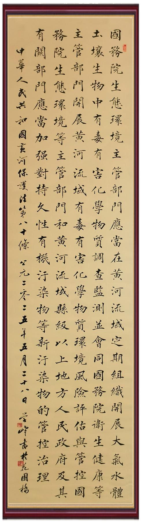 黃河寧,天下平。黃河是中華民族的發(fā)源地和搖籃,保護黃河是事關中華民族偉大復興的千秋大計?!吨腥A人民共和國黃河保護法》為推進水資源節(jié)約集約利用、保護傳承弘揚黃河文化、推動黃河流域生態(tài)保護和高質量發(fā)展提供了有力法治保障。繼書寫《中華人民共和國民法典》《中華人民共和國憲法》《中華人民共和國澳門特別行政區(qū)基本法》《中華人民共和國香港特別行政區(qū)基本法》《中華人民共和國國旗法》《中華人民共和國國徽法》《中華人民共和國國歌法》《中華人民共和國法官法》等法律法規(guī)之后,法制日報社聯(lián)合沿黃九?。▍^(qū))司法廳、書法家協(xié)會,將筆端對準《中華人民共和國黃河保護法》。