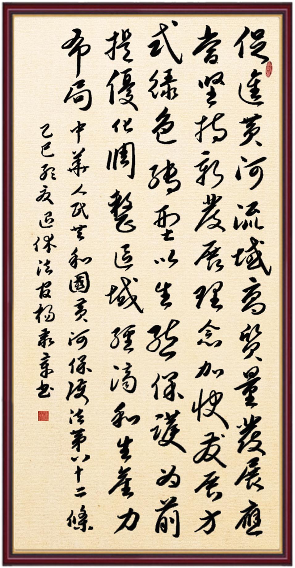 黃河寧,天下平。黃河是中華民族的發(fā)源地和搖籃,保護黃河是事關(guān)中華民族偉大復(fù)興的千秋大計?!吨腥A人民共和國黃河保護法》為推進水資源節(jié)約集約利用、保護傳承弘揚黃河文化、推動黃河流域生態(tài)保護和高質(zhì)量發(fā)展提供了有力法治保障。繼書寫《中華人民共和國民法典》《中華人民共和國憲法》《中華人民共和國澳門特別行政區(qū)基本法》《中華人民共和國香港特別行政區(qū)基本法》《中華人民共和國國旗法》《中華人民共和國國徽法》《中華人民共和國國歌法》《中華人民共和國法官法》等法律法規(guī)之后,法制日報社聯(lián)合沿黃九?。▍^(qū))司法廳、書法家協(xié)會,將筆端對準《中華人民共和國黃河保護法》。