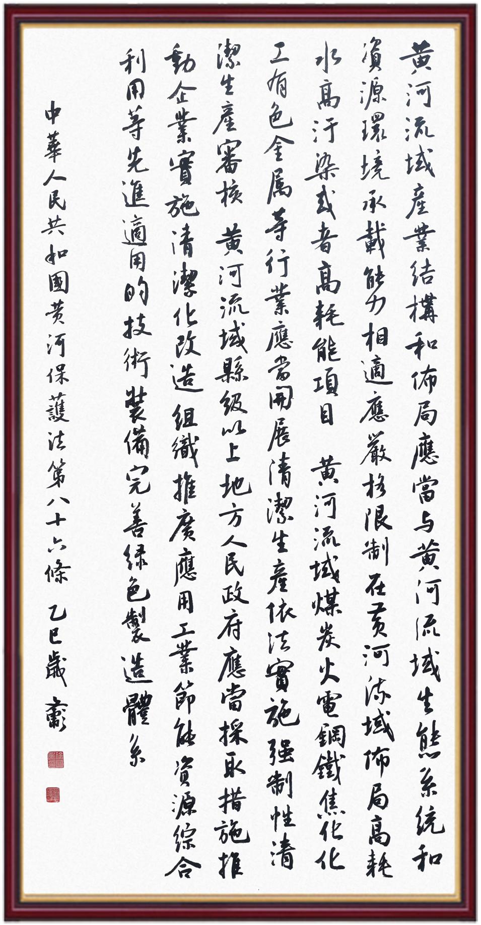 黃河寧,天下平。黃河是中華民族的發(fā)源地和搖籃,保護(hù)黃河是事關(guān)中華民族偉大復(fù)興的千秋大計(jì)?!吨腥A人民共和國(guó)黃河保護(hù)法》為推進(jìn)水資源節(jié)約集約利用、保護(hù)傳承弘揚(yáng)黃河文化、推動(dòng)黃河流域生態(tài)保護(hù)和高質(zhì)量發(fā)展提供了有力法治保障。繼書(shū)寫(xiě)《中華人民共和國(guó)民法典》《中華人民共和國(guó)憲法》《中華人民共和國(guó)澳門(mén)特別行政區(qū)基本法》《中華人民共和國(guó)香港特別行政區(qū)基本法》《中華人民共和國(guó)國(guó)旗法》《中華人民共和國(guó)國(guó)徽法》《中華人民共和國(guó)國(guó)歌法》《中華人民共和國(guó)法官法》等法律法規(guī)之后,法制日?qǐng)?bào)社聯(lián)合沿黃九?。▍^(qū))司法廳、書(shū)法家協(xié)會(huì),將筆端對(duì)準(zhǔn)《中華人民共和國(guó)黃河保護(hù)法》。