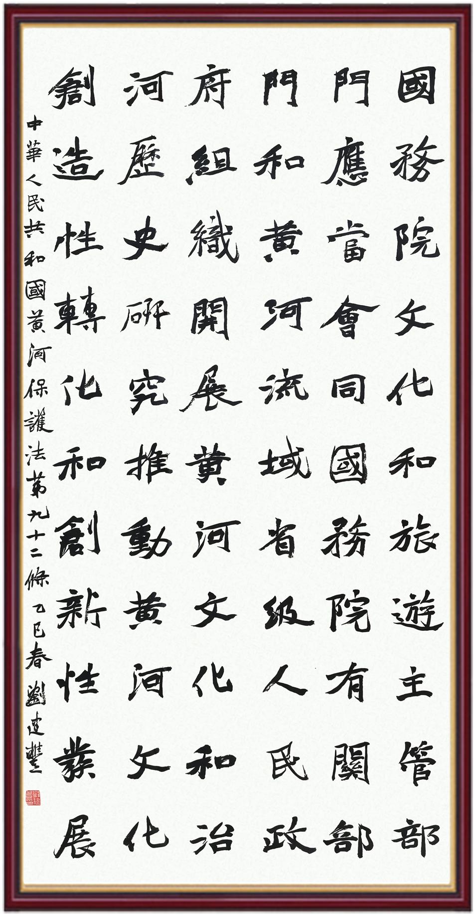 黃河寧,天下平。黃河是中華民族的發(fā)源地和搖籃,保護黃河是事關(guān)中華民族偉大復(fù)興的千秋大計?!吨腥A人民共和國黃河保護法》為推進水資源節(jié)約集約利用、保護傳承弘揚黃河文化、推動黃河流域生態(tài)保護和高質(zhì)量發(fā)展提供了有力法治保障。繼書寫《中華人民共和國民法典》《中華人民共和國憲法》《中華人民共和國澳門特別行政區(qū)基本法》《中華人民共和國香港特別行政區(qū)基本法》《中華人民共和國國旗法》《中華人民共和國國徽法》《中華人民共和國國歌法》《中華人民共和國法官法》等法律法規(guī)之后,法制日報社聯(lián)合沿黃九?。▍^(qū))司法廳、書法家協(xié)會,將筆端對準(zhǔn)《中華人民共和國黃河保護法》。