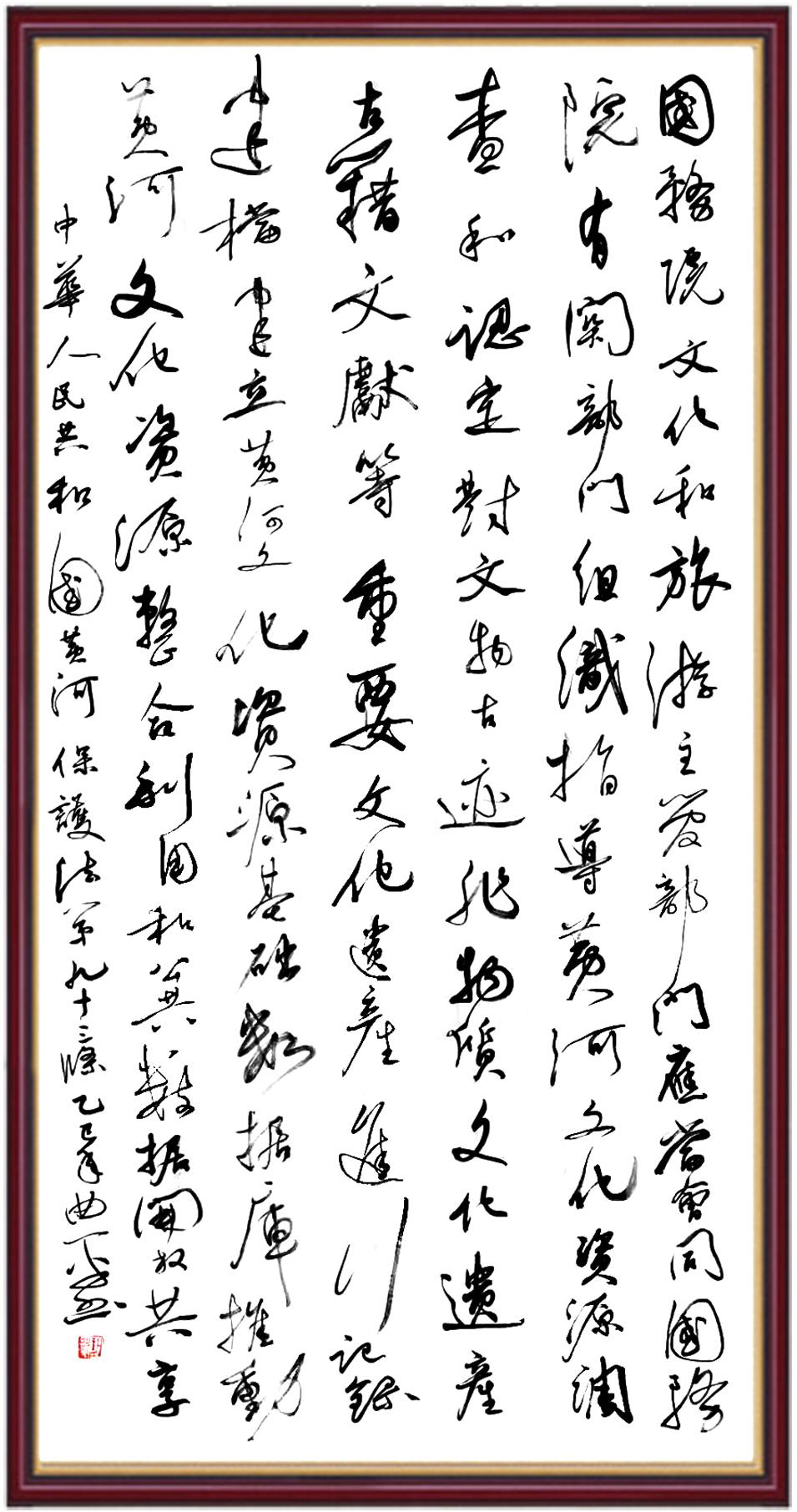 黃河寧,天下平。黃河是中華民族的發(fā)源地和搖籃,保護黃河是事關中華民族偉大復興的千秋大計?!吨腥A人民共和國黃河保護法》為推進水資源節(jié)約集約利用、保護傳承弘揚黃河文化、推動黃河流域生態(tài)保護和高質量發(fā)展提供了有力法治保障。繼書寫《中華人民共和國民法典》《中華人民共和國憲法》《中華人民共和國澳門特別行政區(qū)基本法》《中華人民共和國香港特別行政區(qū)基本法》《中華人民共和國國旗法》《中華人民共和國國徽法》《中華人民共和國國歌法》《中華人民共和國法官法》等法律法規(guī)之后,法制日報社聯(lián)合沿黃九?。▍^(qū))司法廳、書法家協(xié)會,將筆端對準《中華人民共和國黃河保護法》。