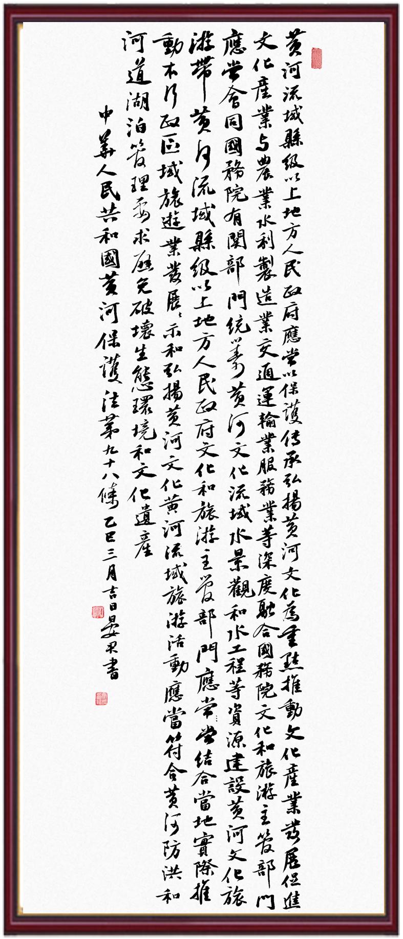 黃河寧,天下平。黃河是中華民族的發(fā)源地和搖籃,保護(hù)黃河是事關(guān)中華民族偉大復(fù)興的千秋大計?!吨腥A人民共和國黃河保護(hù)法》為推進(jìn)水資源節(jié)約集約利用、保護(hù)傳承弘揚(yáng)黃河文化、推動黃河流域生態(tài)保護(hù)和高質(zhì)量發(fā)展提供了有力法治保障。繼書寫《中華人民共和國民法典》《中華人民共和國憲法》《中華人民共和國澳門特別行政區(qū)基本法》《中華人民共和國香港特別行政區(qū)基本法》《中華人民共和國國旗法》《中華人民共和國國徽法》《中華人民共和國國歌法》《中華人民共和國法官法》等法律法規(guī)之后,法制日報社聯(lián)合沿黃九?。▍^(qū))司法廳、書法家協(xié)會,將筆端對準(zhǔn)《中華人民共和國黃河保護(hù)法》。