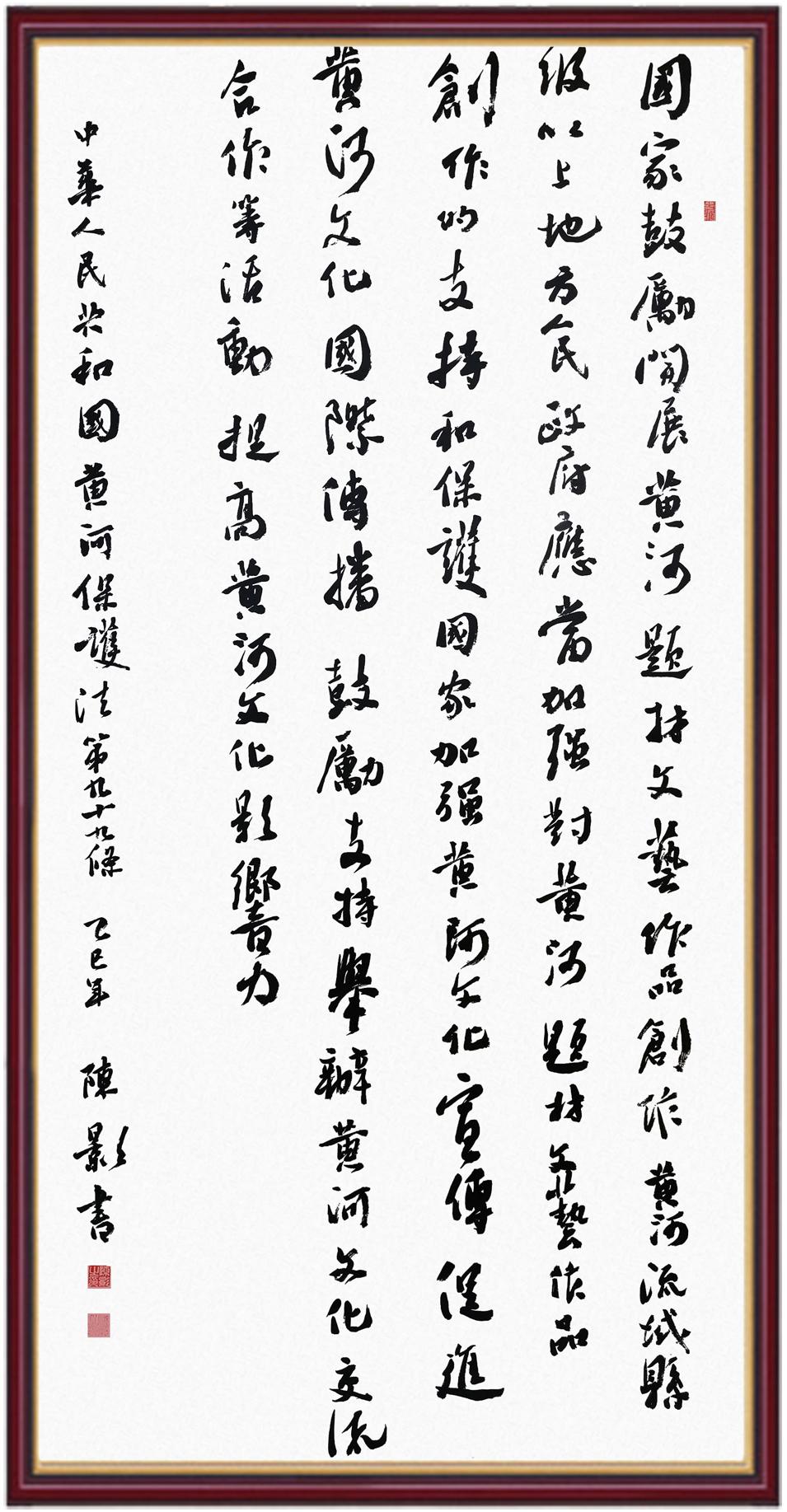 黃河寧,天下平。黃河是中華民族的發(fā)源地和搖籃,保護(hù)黃河是事關(guān)中華民族偉大復(fù)興的千秋大計(jì)。《中華人民共和國(guó)黃河保護(hù)法》為推進(jìn)水資源節(jié)約集約利用、保護(hù)傳承弘揚(yáng)黃河文化、推動(dòng)黃河流域生態(tài)保護(hù)和高質(zhì)量發(fā)展提供了有力法治保障。繼書(shū)寫(xiě)《中華人民共和國(guó)民法典》《中華人民共和國(guó)憲法》《中華人民共和國(guó)澳門(mén)特別行政區(qū)基本法》《中華人民共和國(guó)香港特別行政區(qū)基本法》《中華人民共和國(guó)國(guó)旗法》《中華人民共和國(guó)國(guó)徽法》《中華人民共和國(guó)國(guó)歌法》《中華人民共和國(guó)法官法》等法律法規(guī)之后,法制日?qǐng)?bào)社聯(lián)合沿黃九?。▍^(qū))司法廳、書(shū)法家協(xié)會(huì),將筆端對(duì)準(zhǔn)《中華人民共和國(guó)黃河保護(hù)法》。