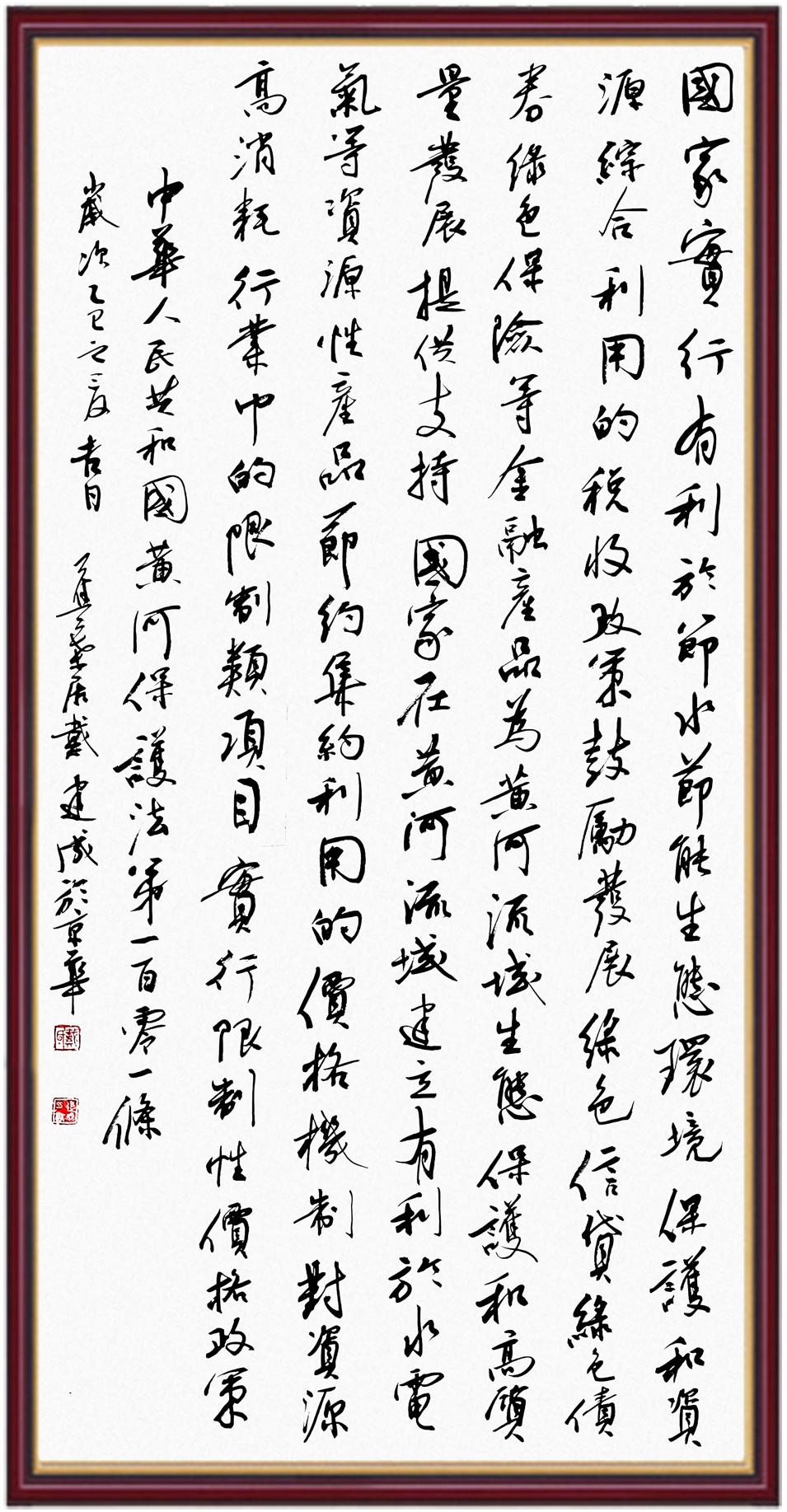 黃河寧,天下平。黃河是中華民族的發(fā)源地和搖籃,保護(hù)黃河是事關(guān)中華民族偉大復(fù)興的千秋大計(jì)?!吨腥A人民共和國(guó)黃河保護(hù)法》為推進(jìn)水資源節(jié)約集約利用、保護(hù)傳承弘揚(yáng)黃河文化、推動(dòng)黃河流域生態(tài)保護(hù)和高質(zhì)量發(fā)展提供了有力法治保障。繼書(shū)寫(xiě)《中華人民共和國(guó)民法典》《中華人民共和國(guó)憲法》《中華人民共和國(guó)澳門特別行政區(qū)基本法》《中華人民共和國(guó)香港特別行政區(qū)基本法》《中華人民共和國(guó)國(guó)旗法》《中華人民共和國(guó)國(guó)徽法》《中華人民共和國(guó)國(guó)歌法》《中華人民共和國(guó)法官法》等法律法規(guī)之后,法制日?qǐng)?bào)社聯(lián)合沿黃九?。▍^(qū))司法廳、書(shū)法家協(xié)會(huì),將筆端對(duì)準(zhǔn)《中華人民共和國(guó)黃河保護(hù)法》。