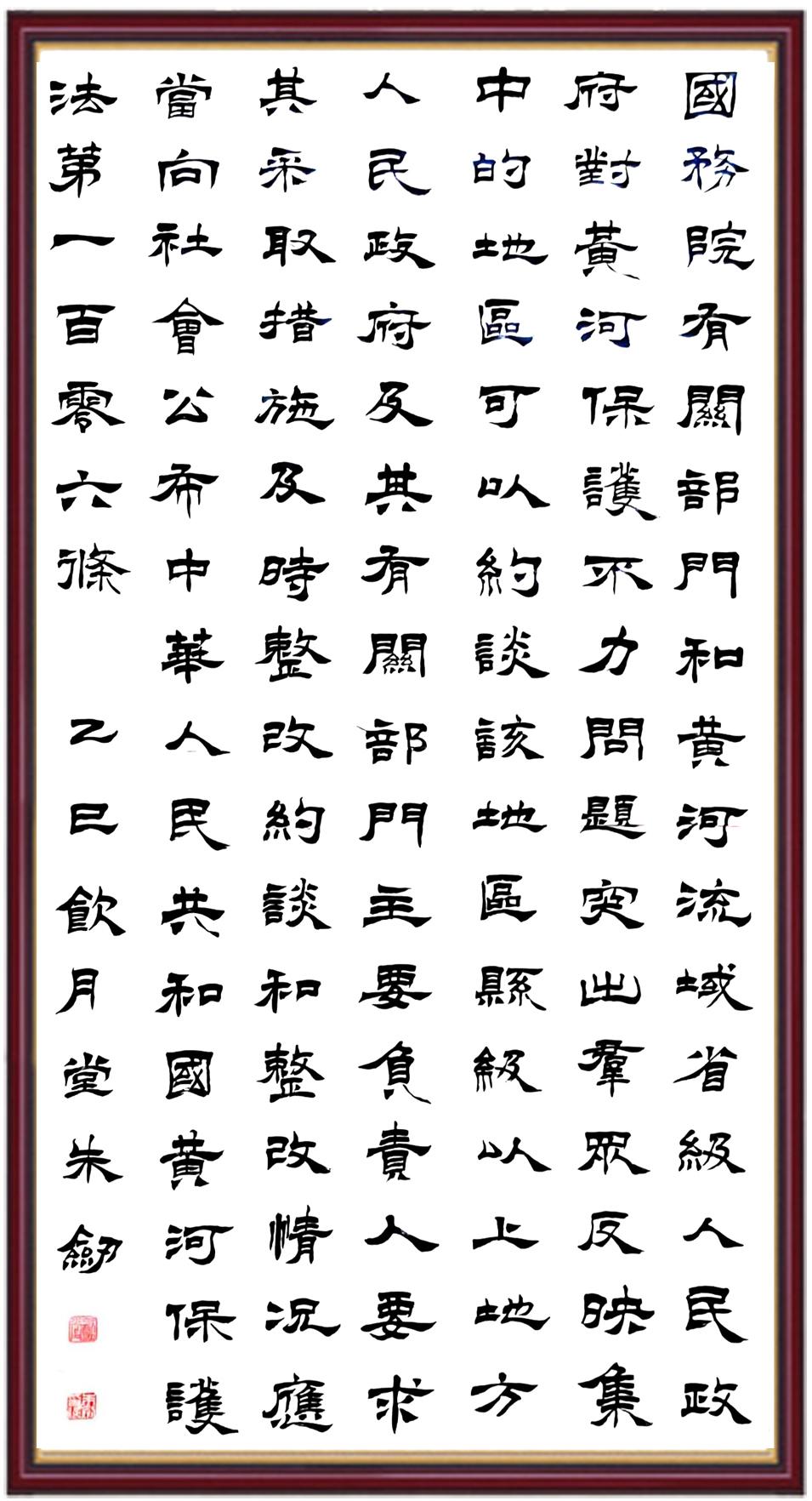 黃河寧,天下平。黃河是中華民族的發(fā)源地和搖籃,保護黃河是事關(guān)中華民族偉大復(fù)興的千秋大計?!吨腥A人民共和國黃河保護法》為推進水資源節(jié)約集約利用、保護傳承弘揚黃河文化、推動黃河流域生態(tài)保護和高質(zhì)量發(fā)展提供了有力法治保障。繼書寫《中華人民共和國民法典》《中華人民共和國憲法》《中華人民共和國澳門特別行政區(qū)基本法》《中華人民共和國香港特別行政區(qū)基本法》《中華人民共和國國旗法》《中華人民共和國國徽法》《中華人民共和國國歌法》《中華人民共和國法官法》等法律法規(guī)之后,法制日報社聯(lián)合沿黃九?。▍^(qū))司法廳、書法家協(xié)會,將筆端對準《中華人民共和國黃河保護法》。