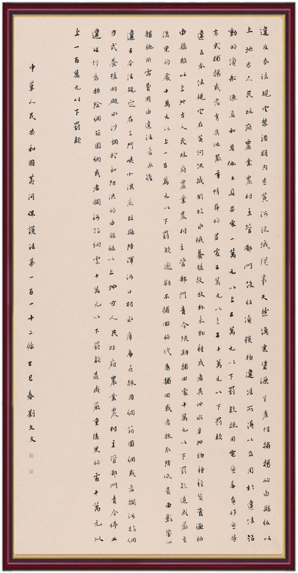 黃河寧,天下平。黃河是中華民族的發(fā)源地和搖籃,保護(hù)黃河是事關(guān)中華民族偉大復(fù)興的千秋大計?!吨腥A人民共和國黃河保護(hù)法》為推進(jìn)水資源節(jié)約集約利用、保護(hù)傳承弘揚(yáng)黃河文化、推動黃河流域生態(tài)保護(hù)和高質(zhì)量發(fā)展提供了有力法治保障。繼書寫《中華人民共和國民法典》《中華人民共和國憲法》《中華人民共和國澳門特別行政區(qū)基本法》《中華人民共和國香港特別行政區(qū)基本法》《中華人民共和國國旗法》《中華人民共和國國徽法》《中華人民共和國國歌法》《中華人民共和國法官法》等法律法規(guī)之后,法制日報社聯(lián)合沿黃九?。▍^(qū))司法廳、書法家協(xié)會,將筆端對準(zhǔn)《中華人民共和國黃河保護(hù)法》。
