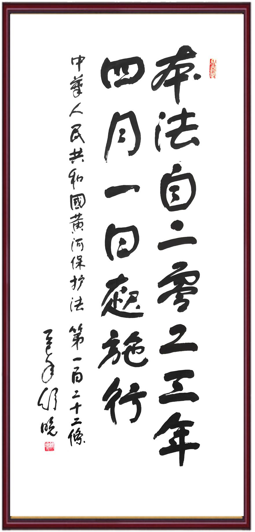 黃河寧,天下平。黃河是中華民族的發(fā)源地和搖籃,保護(hù)黃河是事關(guān)中華民族偉大復(fù)興的千秋大計(jì)?!吨腥A人民共和國(guó)黃河保護(hù)法》為推進(jìn)水資源節(jié)約集約利用、保護(hù)傳承弘揚(yáng)黃河文化、推動(dòng)黃河流域生態(tài)保護(hù)和高質(zhì)量發(fā)展提供了有力法治保障。繼書(shū)寫(xiě)《中華人民共和國(guó)民法典》《中華人民共和國(guó)憲法》《中華人民共和國(guó)澳門(mén)特別行政區(qū)基本法》《中華人民共和國(guó)香港特別行政區(qū)基本法》《中華人民共和國(guó)國(guó)旗法》《中華人民共和國(guó)國(guó)徽法》《中華人民共和國(guó)國(guó)歌法》《中華人民共和國(guó)法官法》等法律法規(guī)之后,法制日?qǐng)?bào)社聯(lián)合沿黃九省(區(qū))司法廳、書(shū)法家協(xié)會(huì),將筆端對(duì)準(zhǔn)《中華人民共和國(guó)黃河保護(hù)法》。