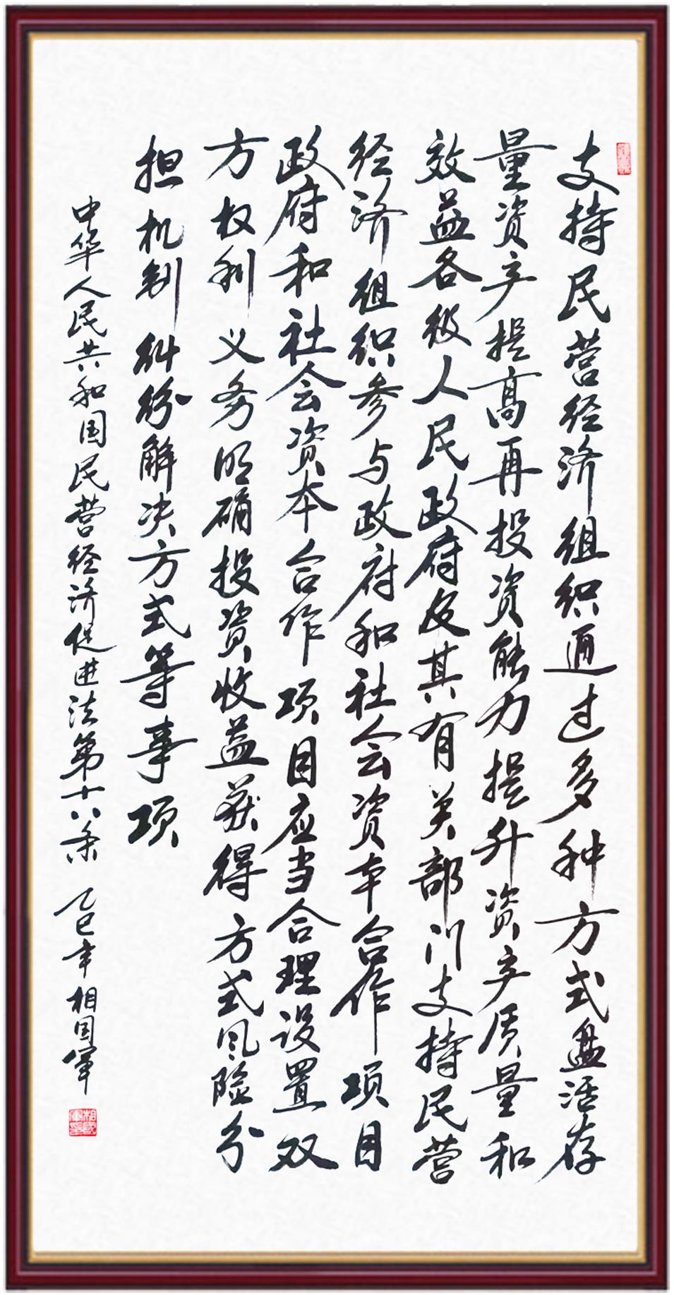 《中華人民共和國民營經(jīng)濟促進法》自今年5月20日起施行。作為我國首部專門關(guān)于民營經(jīng)濟發(fā)展的基礎(chǔ)性法律,民營經(jīng)濟促進法將支持和保障民營經(jīng)濟發(fā)展的法律制度融入中國特色社會主義法律體系,具有重大的法治意義,為促進民營經(jīng)濟持續(xù)、健康、高質(zhì)量發(fā)展提供了堅實的法治保障。為更好地學(xué)習(xí)、宣傳、貫徹這部法律,法治日報社聯(lián)合司法部普法與依法治理局,開展“‘書·法’系列活動之書寫《中華人民共和國民營經(jīng)濟促進法》”活動。