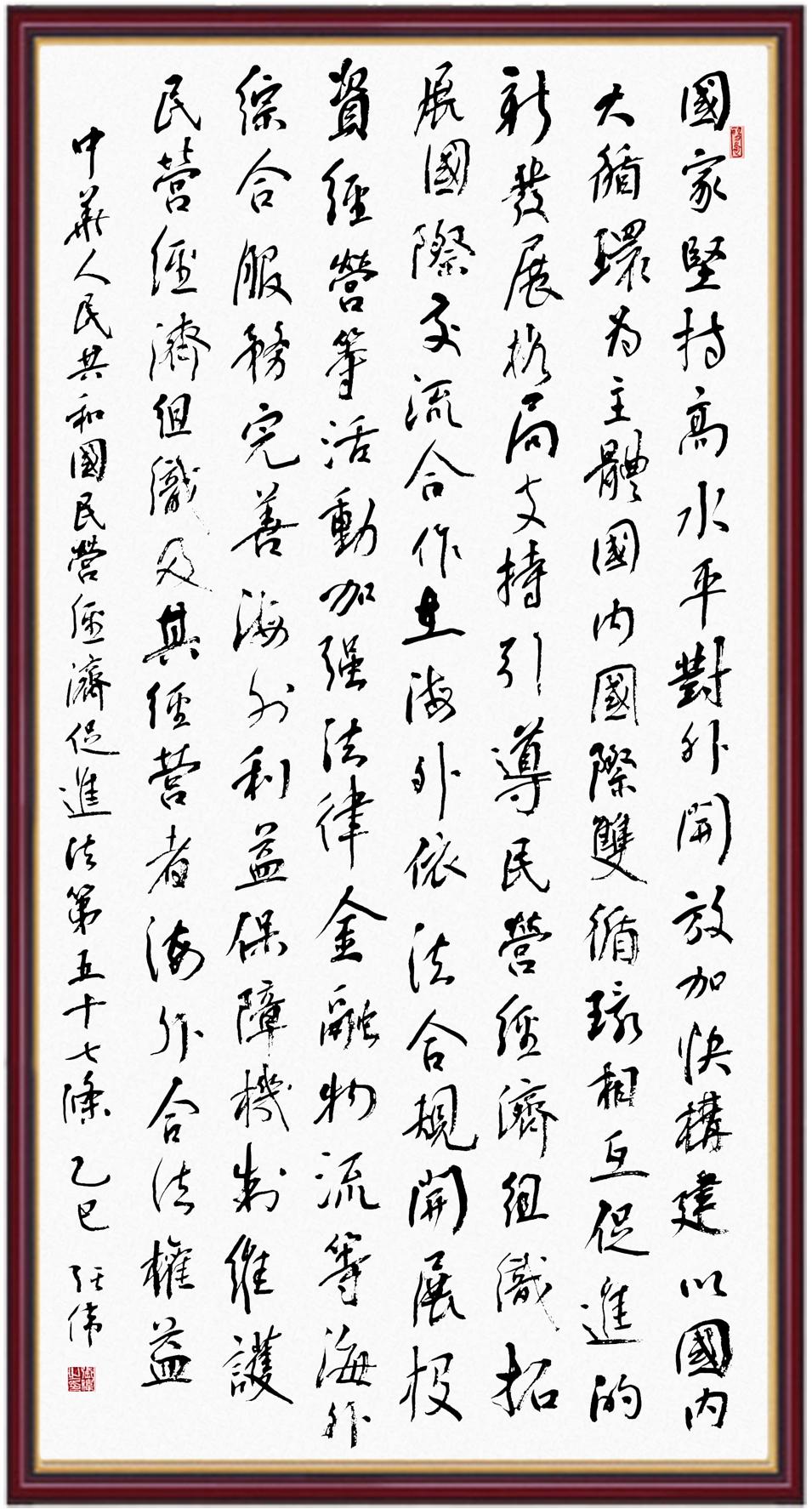 《中華人民共和國民營經(jīng)濟(jì)促進(jìn)法》自今年5月20日起施行。作為我國首部專門關(guān)于民營經(jīng)濟(jì)發(fā)展的基礎(chǔ)性法律,民營經(jīng)濟(jì)促進(jìn)法將支持和保障民營經(jīng)濟(jì)發(fā)展的法律制度融入中國特色社會主義法律體系,具有重大的法治意義,為促進(jìn)民營經(jīng)濟(jì)持續(xù)、健康、高質(zhì)量發(fā)展提供了堅(jiān)實(shí)的法治保障。為更好地學(xué)習(xí)、宣傳、貫徹這部法律,法治日報(bào)社聯(lián)合司法部普法與依法治理局,開展“‘書·法’系列活動之書寫《中華人民共和國民營經(jīng)濟(jì)促進(jìn)法》”活動。