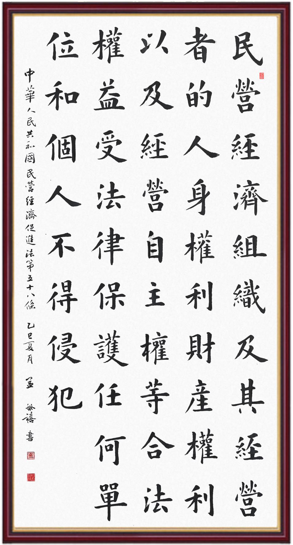 《中華人民共和國(guó)民營(yíng)經(jīng)濟(jì)促進(jìn)法》自今年5月20日起施行。作為我國(guó)首部專門關(guān)于民營(yíng)經(jīng)濟(jì)發(fā)展的基礎(chǔ)性法律,民營(yíng)經(jīng)濟(jì)促進(jìn)法將支持和保障民營(yíng)經(jīng)濟(jì)發(fā)展的法律制度融入中國(guó)特色社會(huì)主義法律體系,具有重大的法治意義,為促進(jìn)民營(yíng)經(jīng)濟(jì)持續(xù)、健康、高質(zhì)量發(fā)展提供了堅(jiān)實(shí)的法治保障。為更好地學(xué)習(xí)、宣傳、貫徹這部法律,法治日?qǐng)?bào)社聯(lián)合司法部普法與依法治理局,開展“‘書·法’系列活動(dòng)之書寫《中華人民共和國(guó)民營(yíng)經(jīng)濟(jì)促進(jìn)法》”活動(dòng)。