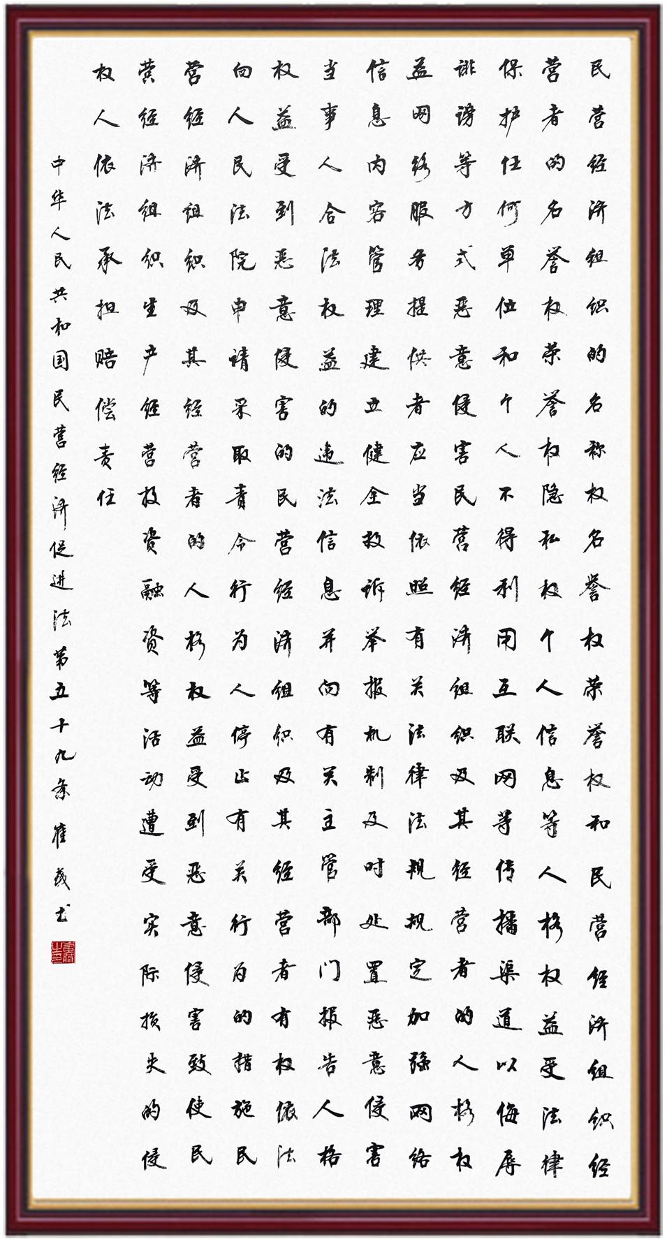 《中華人民共和國(guó)民營(yíng)經(jīng)濟(jì)促進(jìn)法》自今年5月20日起施行。作為我國(guó)首部專門關(guān)于民營(yíng)經(jīng)濟(jì)發(fā)展的基礎(chǔ)性法律,民營(yíng)經(jīng)濟(jì)促進(jìn)法將支持和保障民營(yíng)經(jīng)濟(jì)發(fā)展的法律制度融入中國(guó)特色社會(huì)主義法律體系,具有重大的法治意義,為促進(jìn)民營(yíng)經(jīng)濟(jì)持續(xù)、健康、高質(zhì)量發(fā)展提供了堅(jiān)實(shí)的法治保障。為更好地學(xué)習(xí)、宣傳、貫徹這部法律,法治日?qǐng)?bào)社聯(lián)合司法部普法與依法治理局,開展“‘書·法’系列活動(dòng)之書寫《中華人民共和國(guó)民營(yíng)經(jīng)濟(jì)促進(jìn)法》”活動(dòng)。