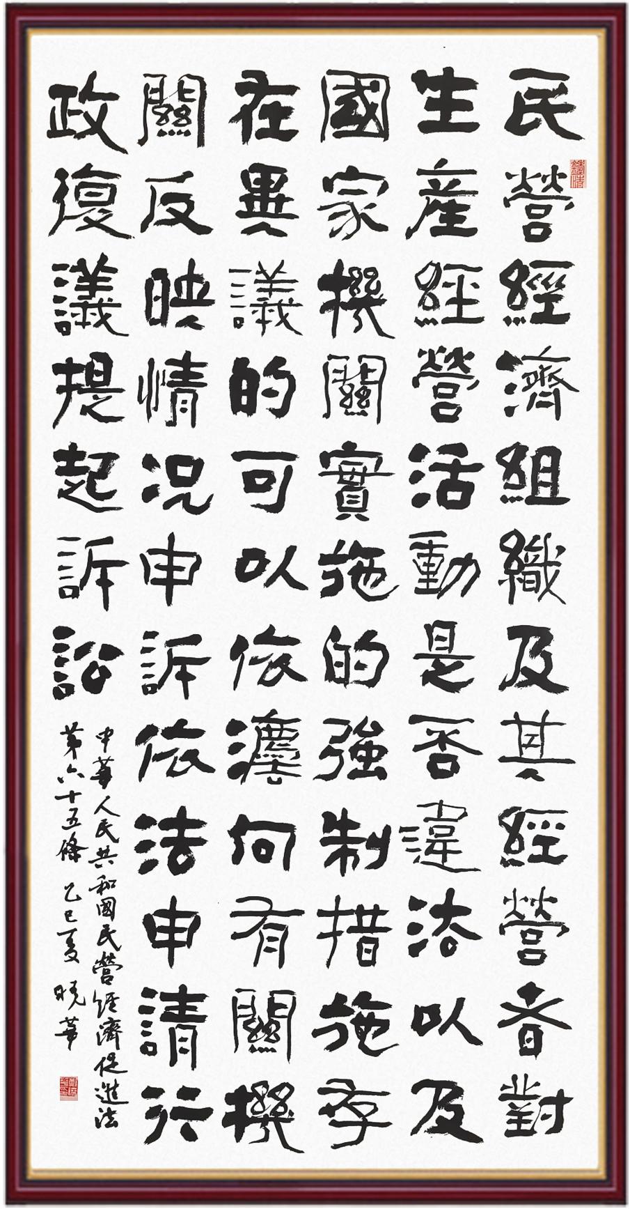 《中華人民共和國民營經(jīng)濟(jì)促進(jìn)法》自今年5月20日起施行。作為我國首部專門關(guān)于民營經(jīng)濟(jì)發(fā)展的基礎(chǔ)性法律,民營經(jīng)濟(jì)促進(jìn)法將支持和保障民營經(jīng)濟(jì)發(fā)展的法律制度融入中國特色社會主義法律體系,具有重大的法治意義,為促進(jìn)民營經(jīng)濟(jì)持續(xù)、健康、高質(zhì)量發(fā)展提供了堅(jiān)實(shí)的法治保障。為更好地學(xué)習(xí)、宣傳、貫徹這部法律,法治日報(bào)社聯(lián)合司法部普法與依法治理局,開展“‘書·法’系列活動之書寫《中華人民共和國民營經(jīng)濟(jì)促進(jìn)法》”活動。