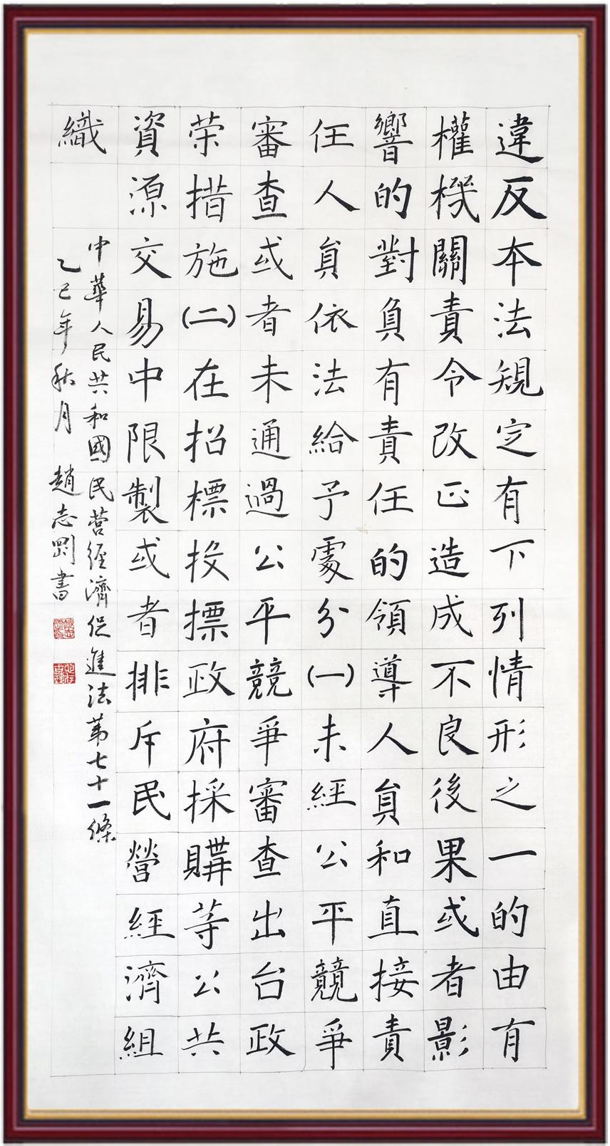 2020年7月11日,由法治日報社主辦、法報文化傳媒(北京)有限公司和北京千音文化傳媒有限公司聯(lián)合承辦的“書·法”系列活動正式啟動?!皶しā被顒又荚跒閯?chuàng)新法治宣傳教育,多開一點腦洞、多花一點心思、多出一點力量、多作一點貢獻,引領(lǐng)和推動更多的人拿起筆來學(xué)法、寫法,在不斷“書·法”過程中,提升自身的法治素養(yǎng),在全社會弘揚法治精神。先后書寫《中華人民共和國民法典》《中華人民共和國憲法》《中華人民共和國澳門特別行政區(qū)基本法》《中華人民共和國香港特別行政區(qū)基本法》《中華人民共和國國旗法》《中華人民共和國國徽法》《中華人民共和國國歌法》《中華人民共和國法官法》《中華人民共和國黃河保護法》等19部法律法規(guī)。