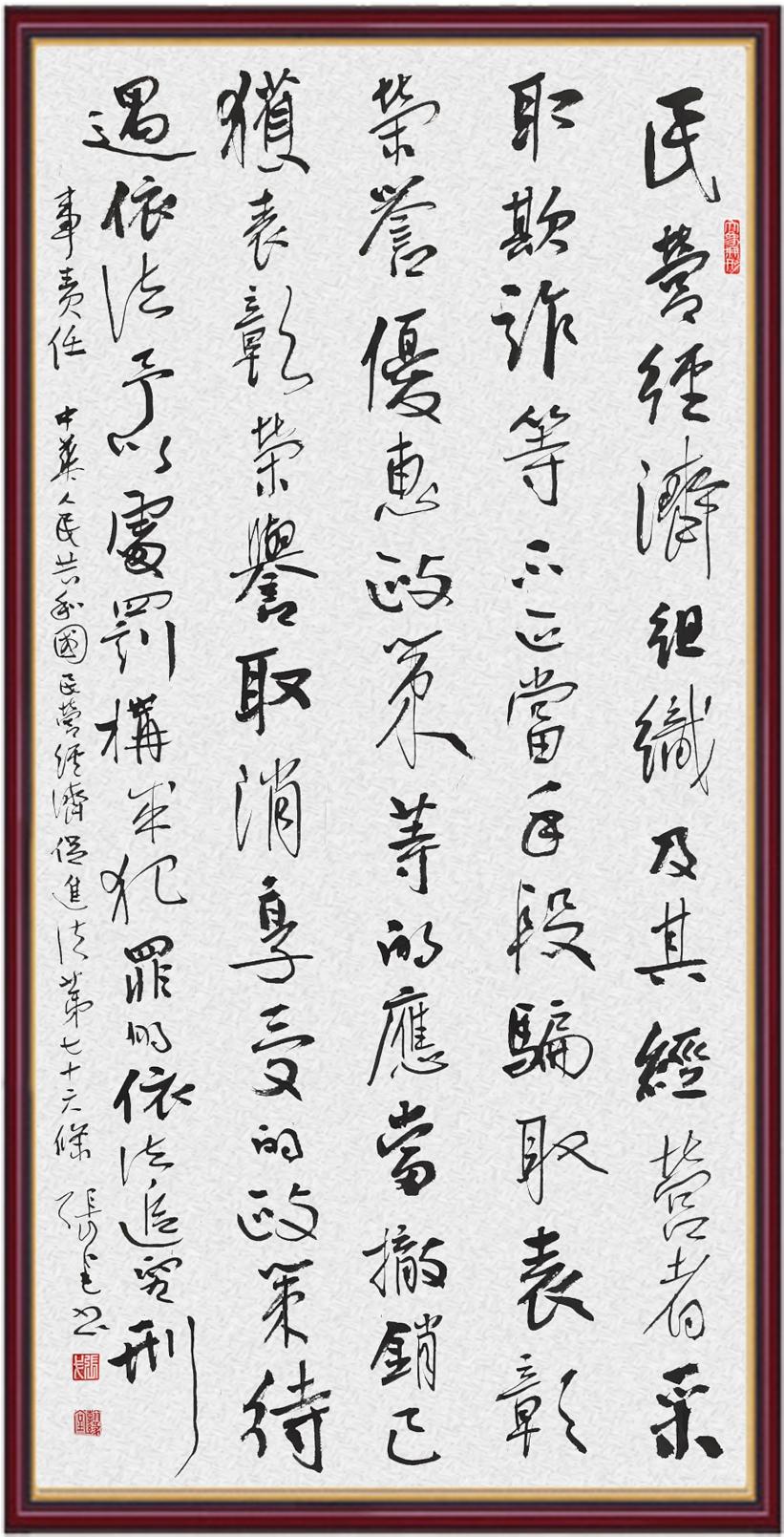2020年7月11日,由法治日報社主辦、法報文化傳媒(北京)有限公司和北京千音文化傳媒有限公司聯合承辦的“書·法”系列活動正式啟動?!皶しā被顒又荚跒閯?chuàng)新法治宣傳教育,多開一點腦洞、多花一點心思、多出一點力量、多作一點貢獻,引領和推動更多的人拿起筆來學法、寫法,在不斷“書·法”過程中,提升自身的法治素養(yǎng),在全社會弘揚法治精神。先后書寫《中華人民共和國民法典》《中華人民共和國憲法》《中華人民共和國澳門特別行政區(qū)基本法》《中華人民共和國香港特別行政區(qū)基本法》《中華人民共和國國旗法》《中華人民共和國國徽法》《中華人民共和國國歌法》《中華人民共和國法官法》《中華人民共和國黃河保護法》等19部法律法規(guī)。