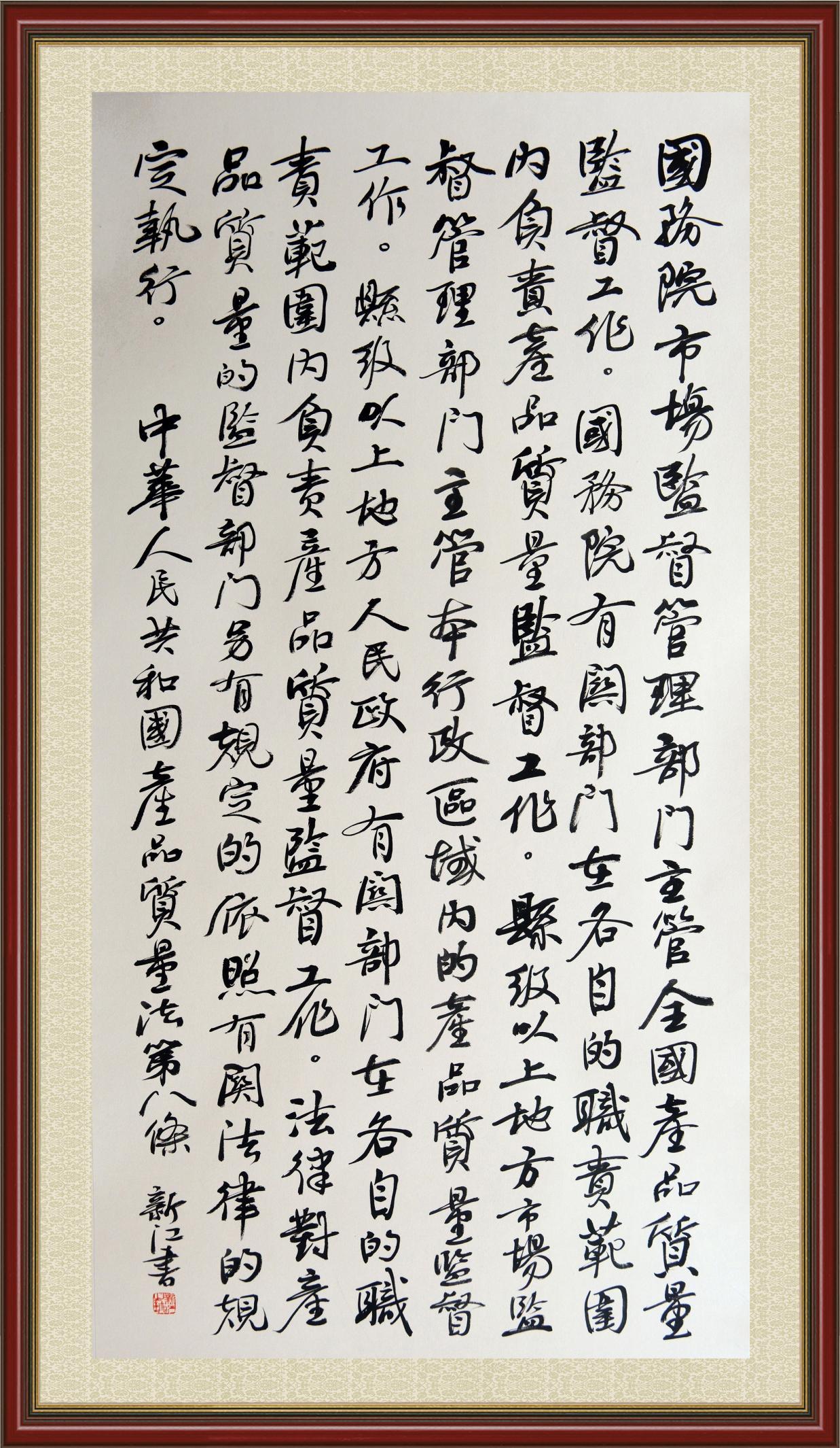《中華人民共和國產(chǎn)品質(zhì)量法》自1993年9月1日起開始施行,先后進行三次修正。作為產(chǎn)品質(zhì)量領(lǐng)域的基本法律,產(chǎn)品質(zhì)量法對規(guī)范產(chǎn)品質(zhì)量管理、維護消費者合法權(quán)益、促進經(jīng)濟社會發(fā)展具有重要意義。為更好地學(xué)習(xí)、宣傳、貫徹這部法律,在國家市場監(jiān)督管理總局法規(guī)司的支持下,法治日報社開展了“‘書·法’系列活動之書寫《中華人民共和國產(chǎn)品質(zhì)量法》”活動。
