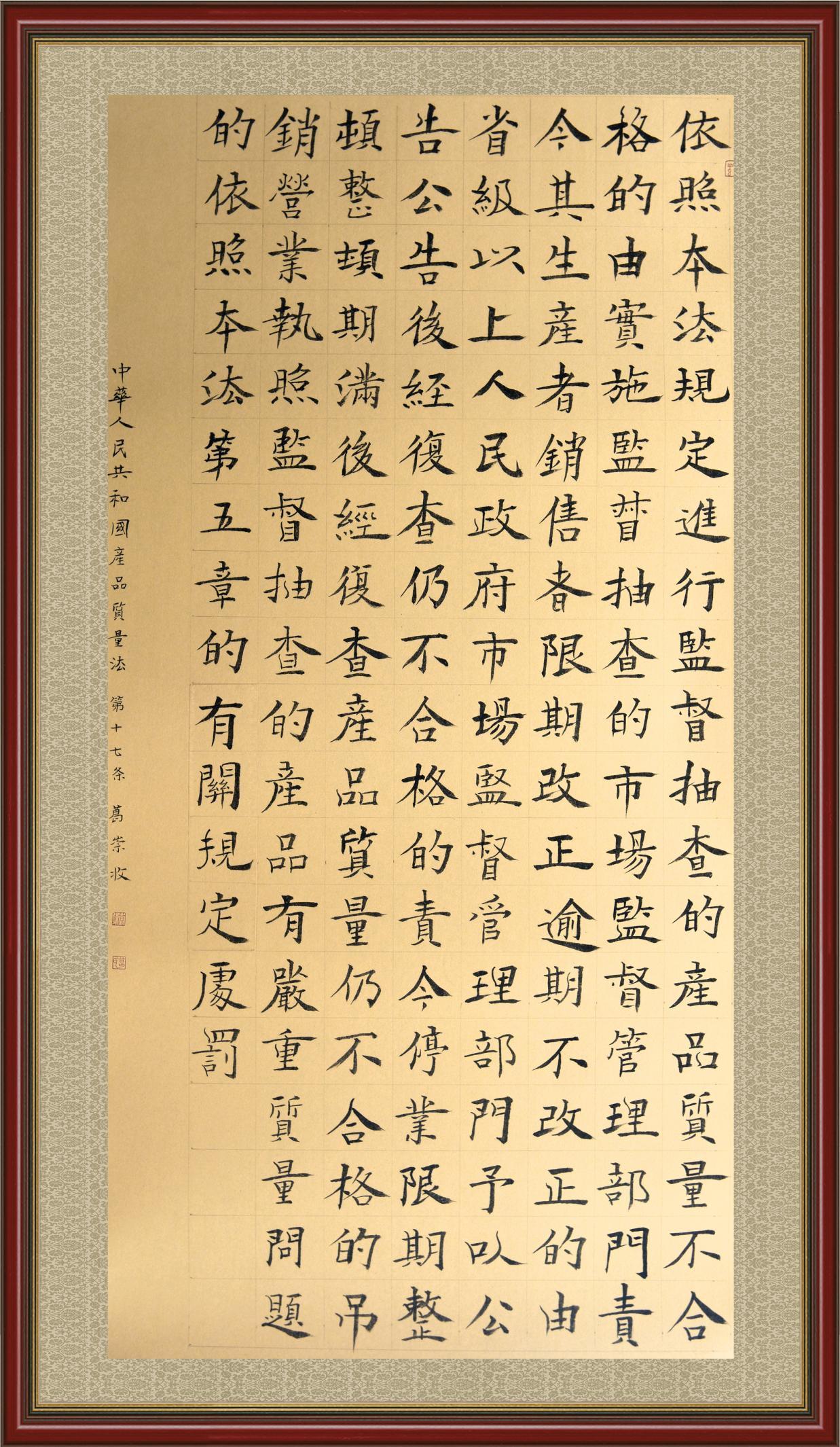 《中華人民共和國(guó)產(chǎn)品質(zhì)量法》自1993年9月1日起開始施行,先后進(jìn)行三次修正。作為產(chǎn)品質(zhì)量領(lǐng)域的基本法律,產(chǎn)品質(zhì)量法對(duì)規(guī)范產(chǎn)品質(zhì)量管理、維護(hù)消費(fèi)者合法權(quán)益、促進(jìn)經(jīng)濟(jì)社會(huì)發(fā)展具有重要意義。為更好地學(xué)習(xí)、宣傳、貫徹這部法律,在國(guó)家市場(chǎng)監(jiān)督管理總局法規(guī)司的支持下,法治日?qǐng)?bào)社開展了“‘書·法’系列活動(dòng)之書寫《中華人民共和國(guó)產(chǎn)品質(zhì)量法》”活動(dòng)。