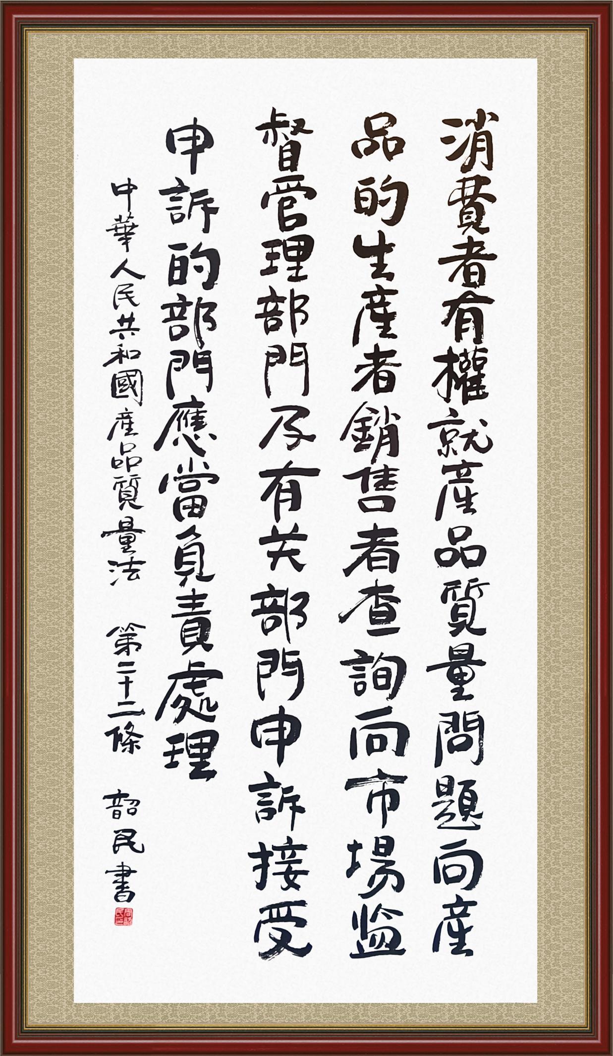 《中華人民共和國(guó)產(chǎn)品質(zhì)量法》自1993年9月1日起開(kāi)始施行,先后進(jìn)行三次修正。作為產(chǎn)品質(zhì)量領(lǐng)域的基本法律,產(chǎn)品質(zhì)量法對(duì)規(guī)范產(chǎn)品質(zhì)量管理、維護(hù)消費(fèi)者合法權(quán)益、促進(jìn)經(jīng)濟(jì)社會(huì)發(fā)展具有重要意義。為更好地學(xué)習(xí)、宣傳、貫徹這部法律,在國(guó)家市場(chǎng)監(jiān)督管理總局法規(guī)司的支持下,法治日?qǐng)?bào)社開(kāi)展了“‘書(shū)·法’系列活動(dòng)之書(shū)寫(xiě)《中華人民共和國(guó)產(chǎn)品質(zhì)量法》”活動(dòng)。