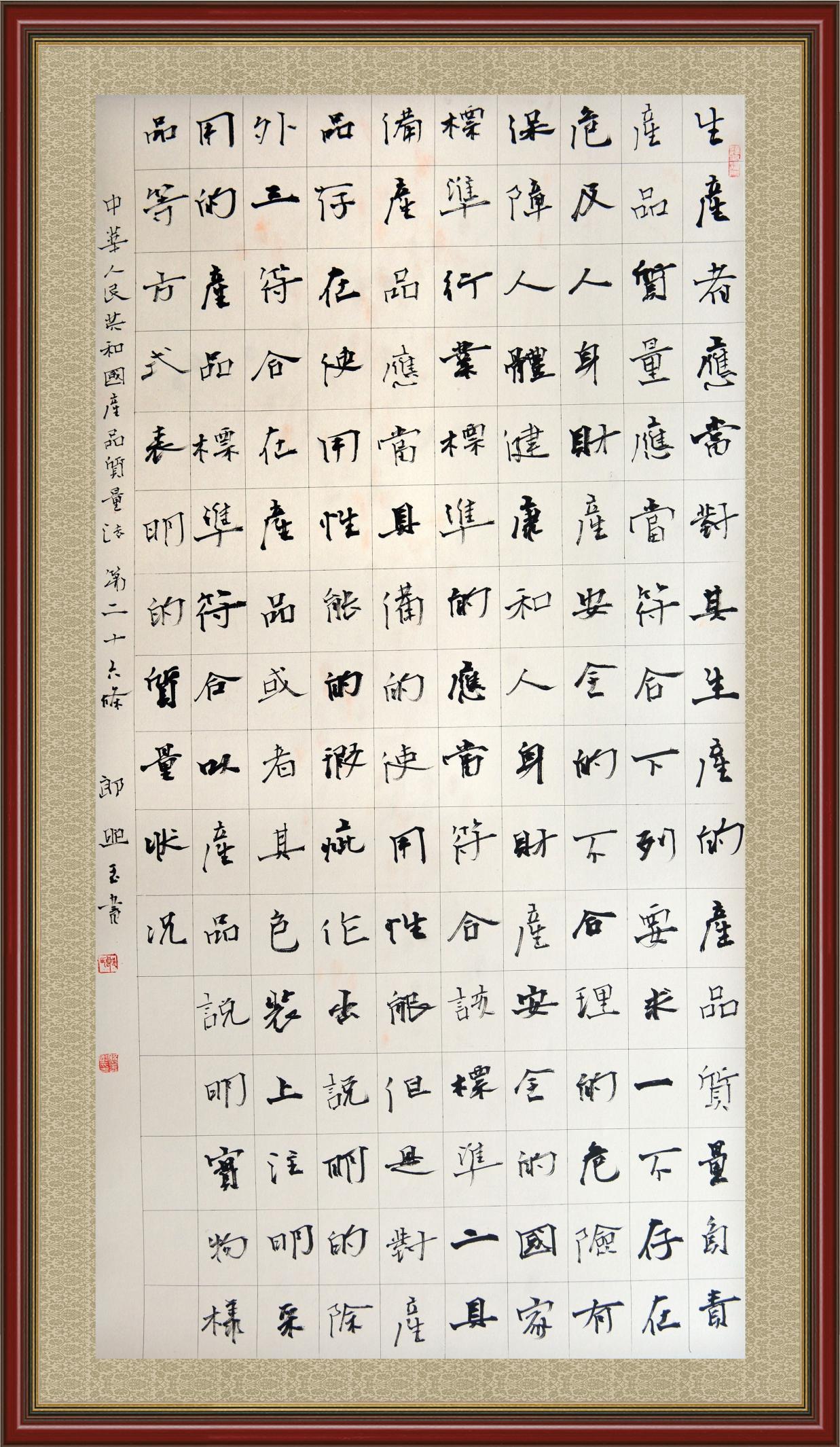 《中華人民共和國產(chǎn)品質(zhì)量法》自1993年9月1日起開始施行,先后進行三次修正。作為產(chǎn)品質(zhì)量領(lǐng)域的基本法律,產(chǎn)品質(zhì)量法對規(guī)范產(chǎn)品質(zhì)量管理、維護消費者合法權(quán)益、促進經(jīng)濟社會發(fā)展具有重要意義。為更好地學習、宣傳、貫徹這部法律,在國家市場監(jiān)督管理總局法規(guī)司的支持下,法治日報社開展了“‘書·法’系列活動之書寫《中華人民共和國產(chǎn)品質(zhì)量法》”活動。