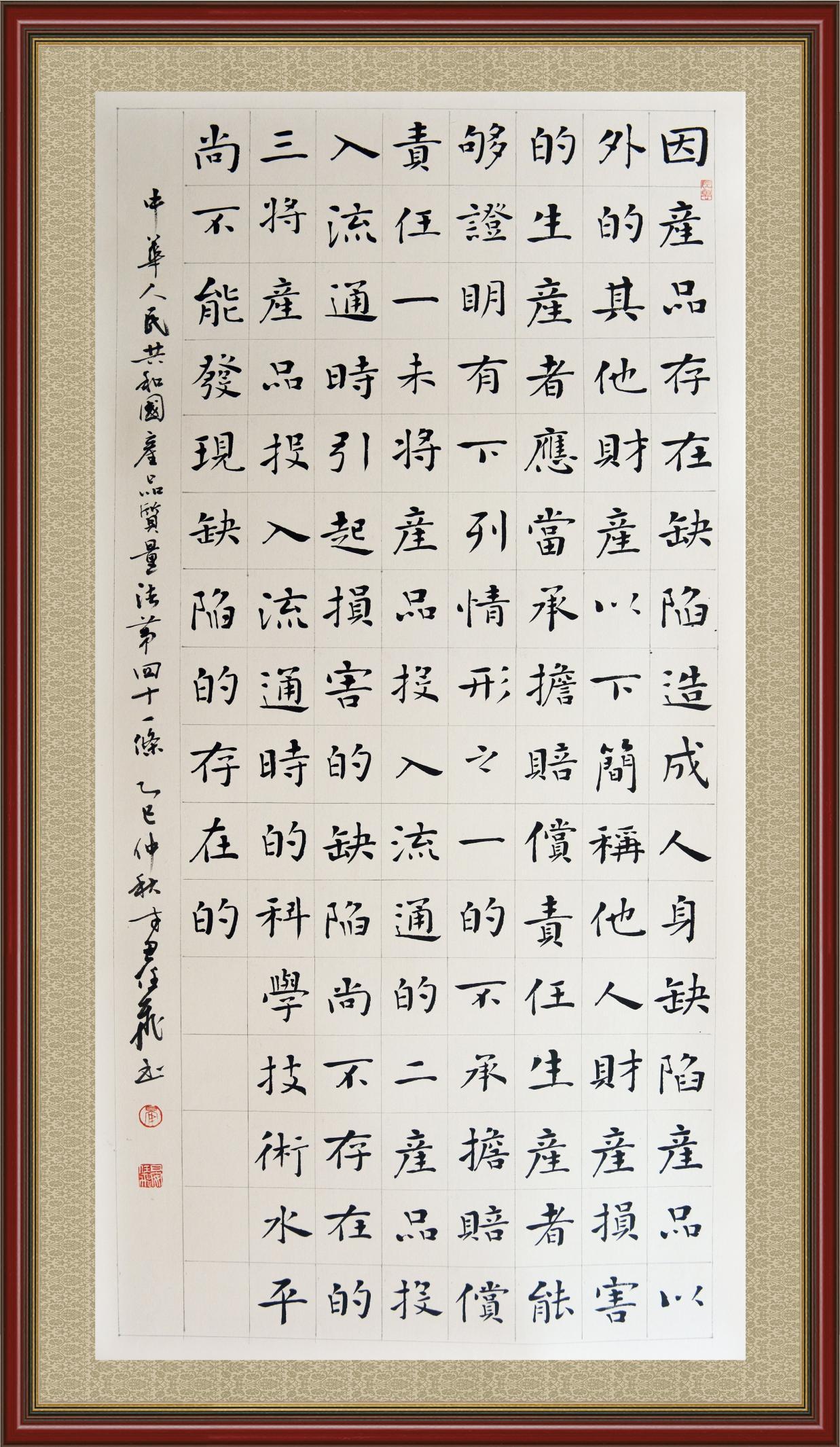 《中華人民共和國產(chǎn)品質(zhì)量法》自1993年9月1日起開始施行,先后進行三次修正。作為產(chǎn)品質(zhì)量領域的基本法律,產(chǎn)品質(zhì)量法對規(guī)范產(chǎn)品質(zhì)量管理、維護消費者合法權益、促進經(jīng)濟社會發(fā)展具有重要意義。為更好地學習、宣傳、貫徹這部法律,在國家市場監(jiān)督管理總局法規(guī)司的支持下,法治日報社開展了“‘書·法’系列活動之書寫《中華人民共和國產(chǎn)品質(zhì)量法》”活動。