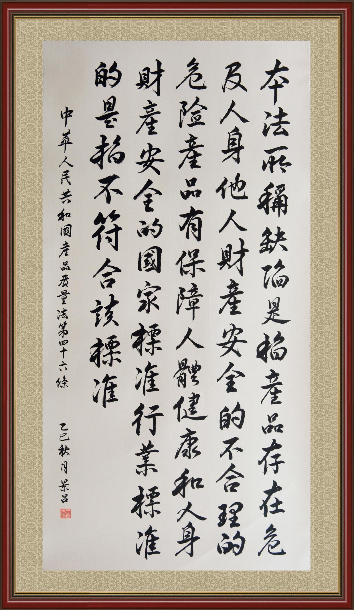 《中華人民共和國產(chǎn)品質(zhì)量法》自1993年9月1日起開始施行,先后進行三次修正。作為產(chǎn)品質(zhì)量領(lǐng)域的基本法律,產(chǎn)品質(zhì)量法對規(guī)范產(chǎn)品質(zhì)量管理、維護消費者合法權(quán)益、促進經(jīng)濟社會發(fā)展具有重要意義。為更好地學(xué)習(xí)、宣傳、貫徹這部法律,在國家市場監(jiān)督管理總局法規(guī)司的支持下,法治日報社開展了“‘書·法’系列活動之書寫《中華人民共和國產(chǎn)品質(zhì)量法》”活動。