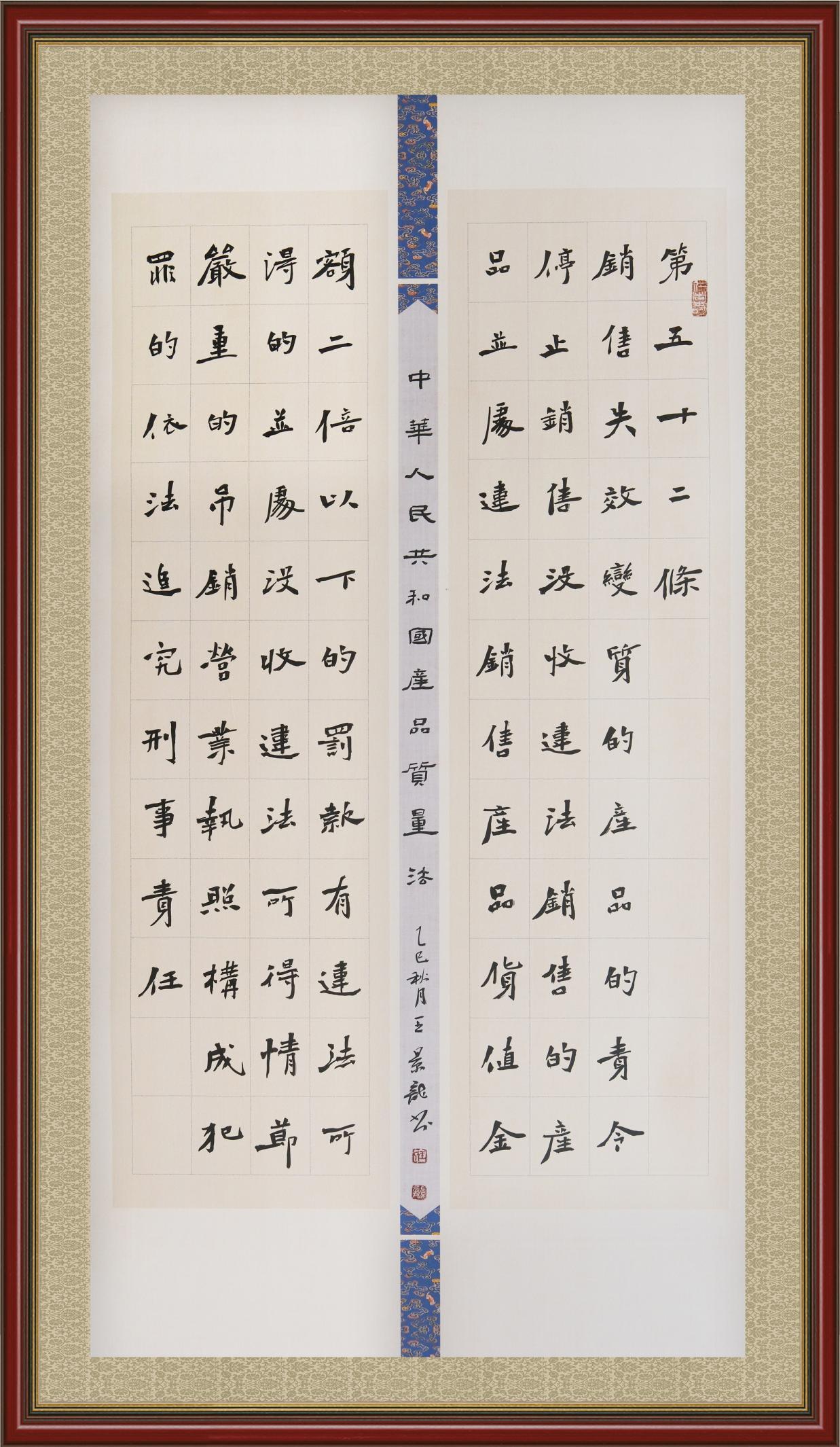 《中華人民共和國產(chǎn)品質量法》自1993年9月1日起開始施行,先后進行三次修正。作為產(chǎn)品質量領域的基本法律,產(chǎn)品質量法對規(guī)范產(chǎn)品質量管理、維護消費者合法權益、促進經(jīng)濟社會發(fā)展具有重要意義。為更好地學習、宣傳、貫徹這部法律,在國家市場監(jiān)督管理總局法規(guī)司的支持下,法治日報社開展了“‘書·法’系列活動之書寫《中華人民共和國產(chǎn)品質量法》”活動。