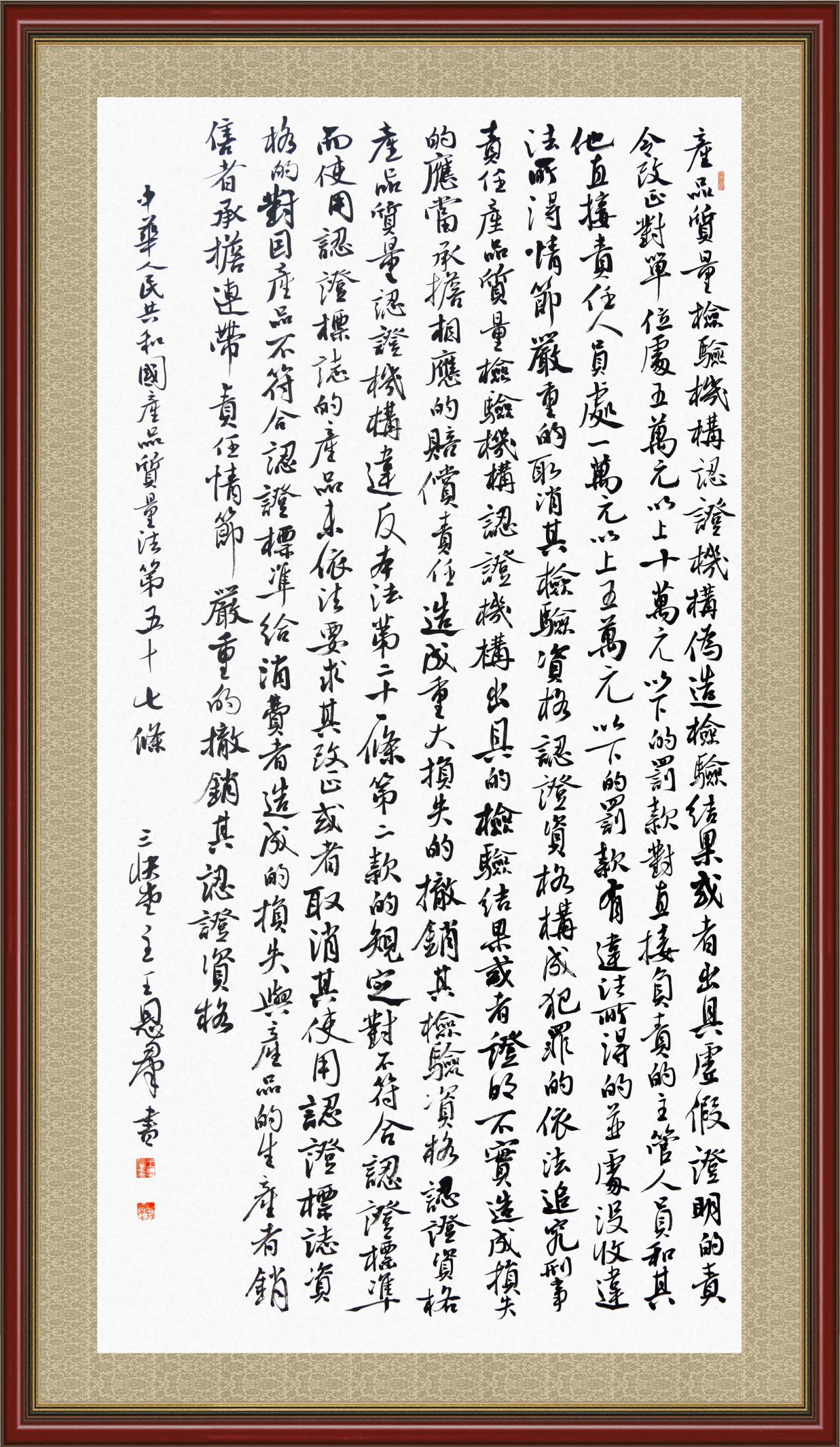 《中華人民共和國(guó)產(chǎn)品質(zhì)量法》自1993年9月1日起開(kāi)始施行,先后進(jìn)行三次修正。作為產(chǎn)品質(zhì)量領(lǐng)域的基本法律,產(chǎn)品質(zhì)量法對(duì)規(guī)范產(chǎn)品質(zhì)量管理、維護(hù)消費(fèi)者合法權(quán)益、促進(jìn)經(jīng)濟(jì)社會(huì)發(fā)展具有重要意義。為更好地學(xué)習(xí)、宣傳、貫徹這部法律,在國(guó)家市場(chǎng)監(jiān)督管理總局法規(guī)司的支持下,法治日?qǐng)?bào)社開(kāi)展了“‘書(shū)·法’系列活動(dòng)之書(shū)寫(xiě)《中華人民共和國(guó)產(chǎn)品質(zhì)量法》”活動(dòng)。