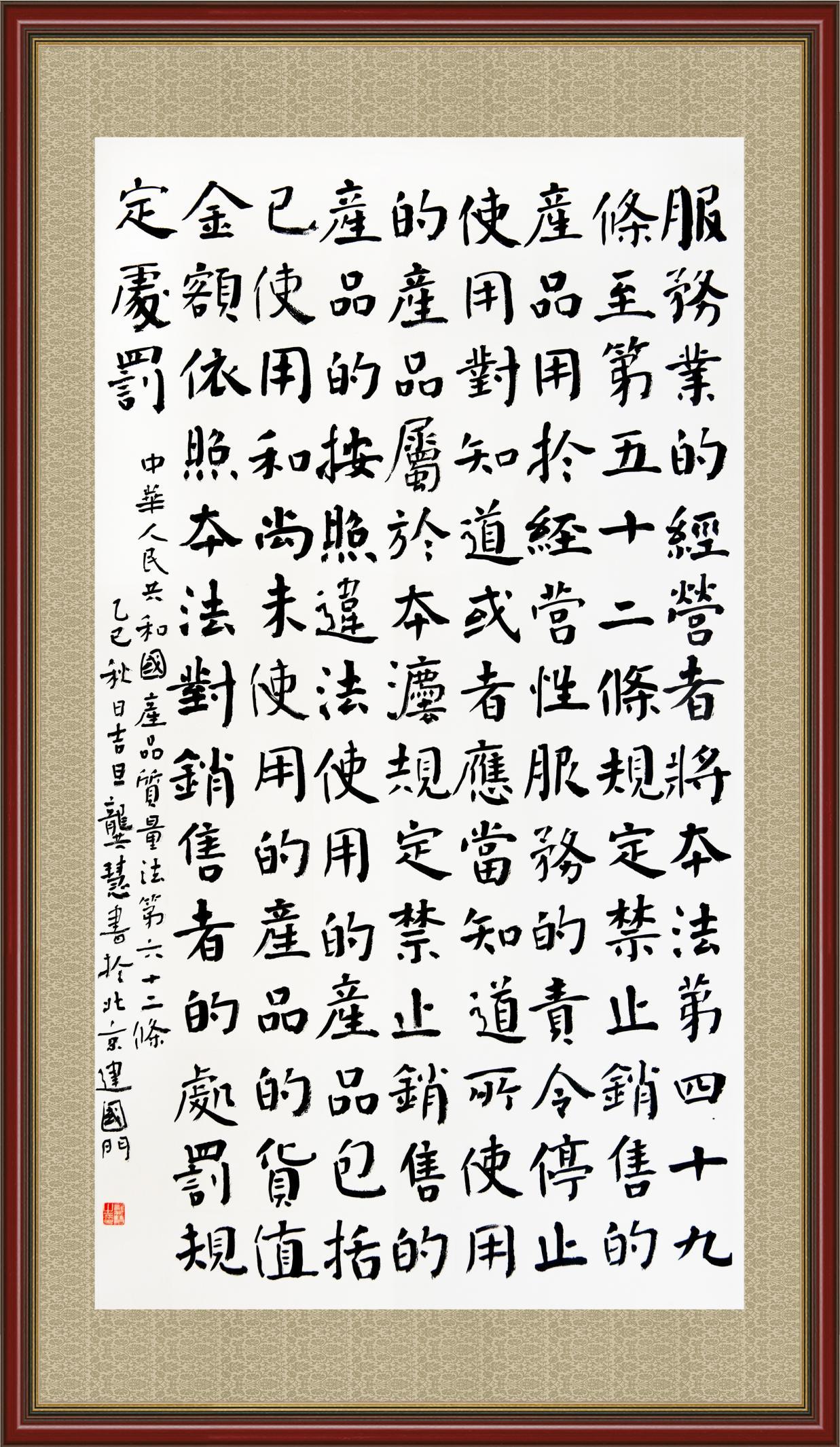 《中華人民共和國(guó)產(chǎn)品質(zhì)量法》自1993年9月1日起開始施行,先后進(jìn)行三次修正。作為產(chǎn)品質(zhì)量領(lǐng)域的基本法律,產(chǎn)品質(zhì)量法對(duì)規(guī)范產(chǎn)品質(zhì)量管理、維護(hù)消費(fèi)者合法權(quán)益、促進(jìn)經(jīng)濟(jì)社會(huì)發(fā)展具有重要意義。為更好地學(xué)習(xí)、宣傳、貫徹這部法律,在國(guó)家市場(chǎng)監(jiān)督管理總局法規(guī)司的支持下,法治日?qǐng)?bào)社開展了“‘書·法’系列活動(dòng)之書寫《中華人民共和國(guó)產(chǎn)品質(zhì)量法》”活動(dòng)。