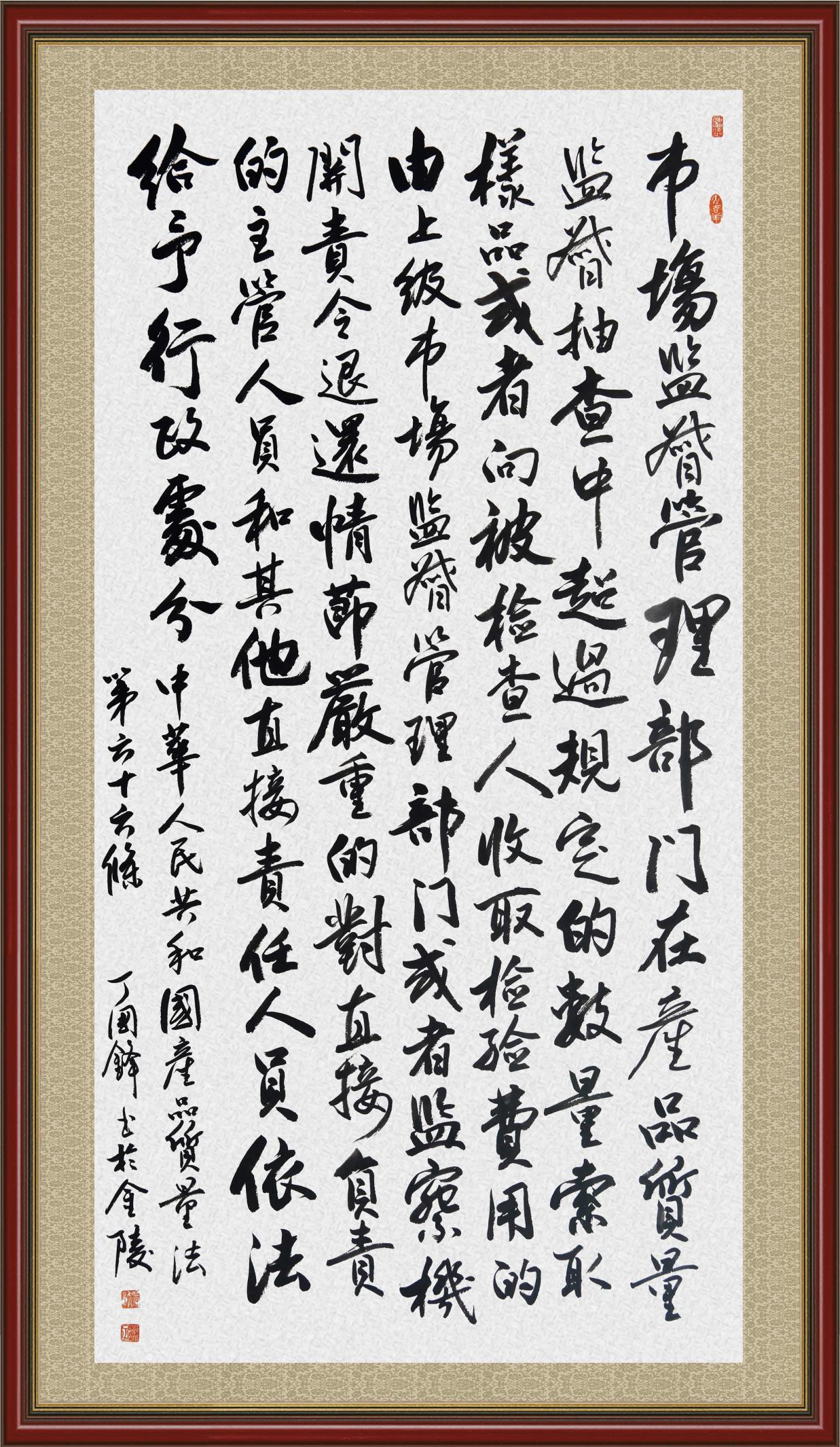 《中華人民共和國產(chǎn)品質(zhì)量法》自1993年9月1日起開始施行,先后進(jìn)行三次修正。作為產(chǎn)品質(zhì)量領(lǐng)域的基本法律,產(chǎn)品質(zhì)量法對規(guī)范產(chǎn)品質(zhì)量管理、維護(hù)消費(fèi)者合法權(quán)益、促進(jìn)經(jīng)濟(jì)社會發(fā)展具有重要意義。為更好地學(xué)習(xí)、宣傳、貫徹這部法律,在國家市場監(jiān)督管理總局法規(guī)司的支持下,法治日報社開展了“‘書·法’系列活動之書寫《中華人民共和國產(chǎn)品質(zhì)量法》”活動。