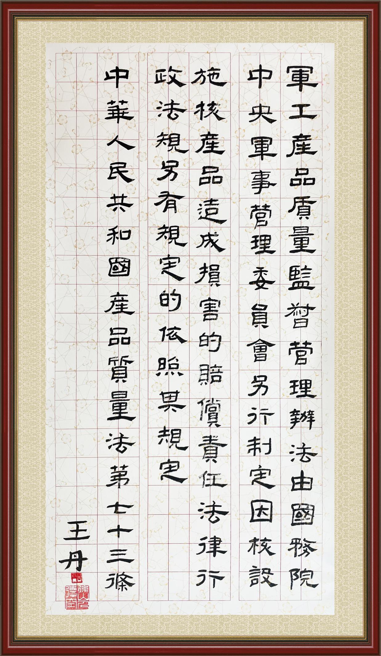 《中華人民共和國(guó)產(chǎn)品質(zhì)量法》自1993年9月1日起開(kāi)始施行,先后進(jìn)行三次修正。作為產(chǎn)品質(zhì)量領(lǐng)域的基本法律,產(chǎn)品質(zhì)量法對(duì)規(guī)范產(chǎn)品質(zhì)量管理、維護(hù)消費(fèi)者合法權(quán)益、促進(jìn)經(jīng)濟(jì)社會(huì)發(fā)展具有重要意義。為更好地學(xué)習(xí)、宣傳、貫徹這部法律,在國(guó)家市場(chǎng)監(jiān)督管理總局法規(guī)司的支持下,法治日?qǐng)?bào)社開(kāi)展了“‘書(shū)·法’系列活動(dòng)之書(shū)寫(xiě)《中華人民共和國(guó)產(chǎn)品質(zhì)量法》”活動(dòng)。