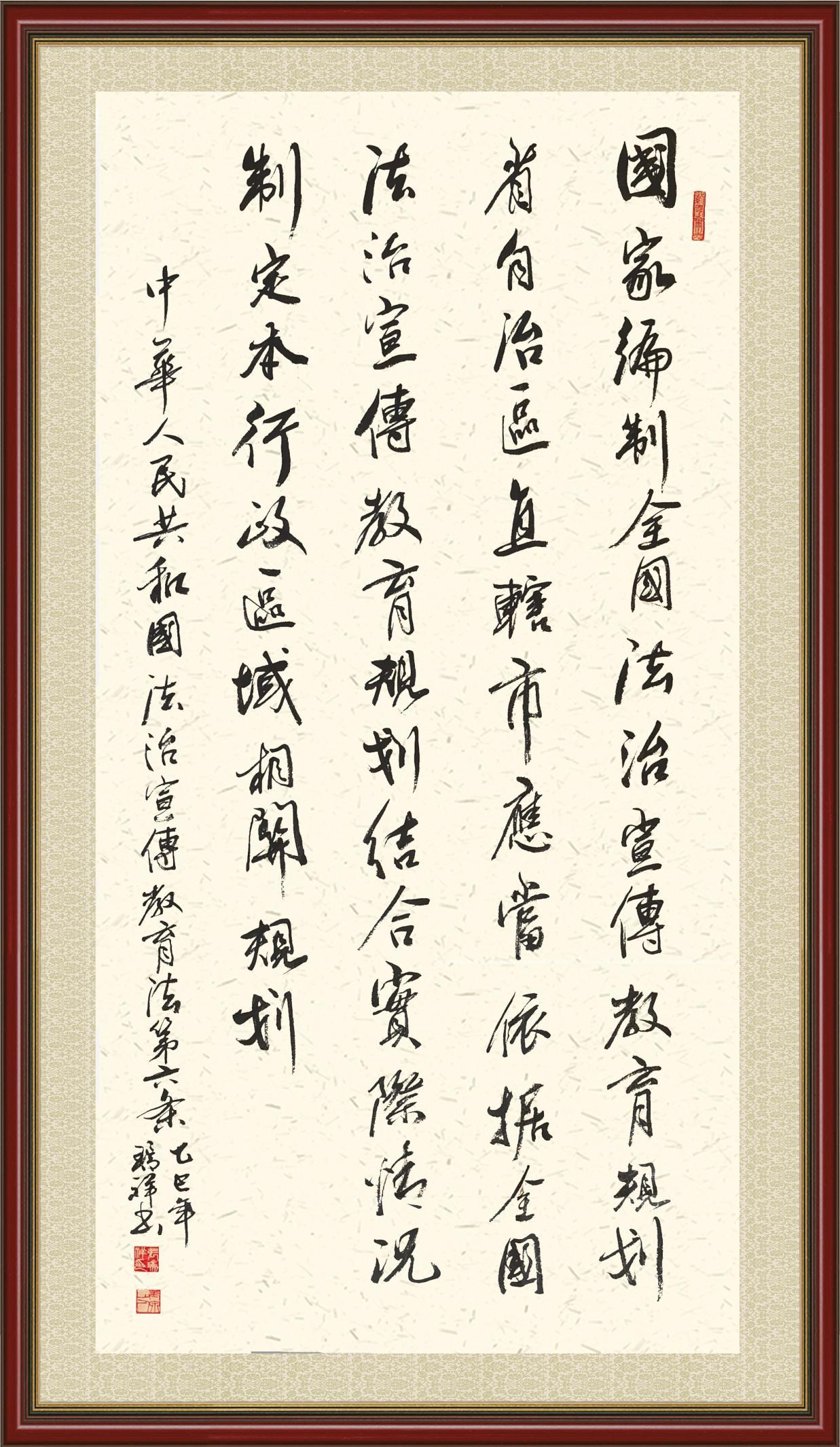 2020年7月11日,由法治日報社主辦的“書·法”系列活動正式啟動,先后書寫《中華人民共和國民法典》《中華人民共和國憲法》《中華人民共和國民營經濟促進法》等21部法律法規(guī)。