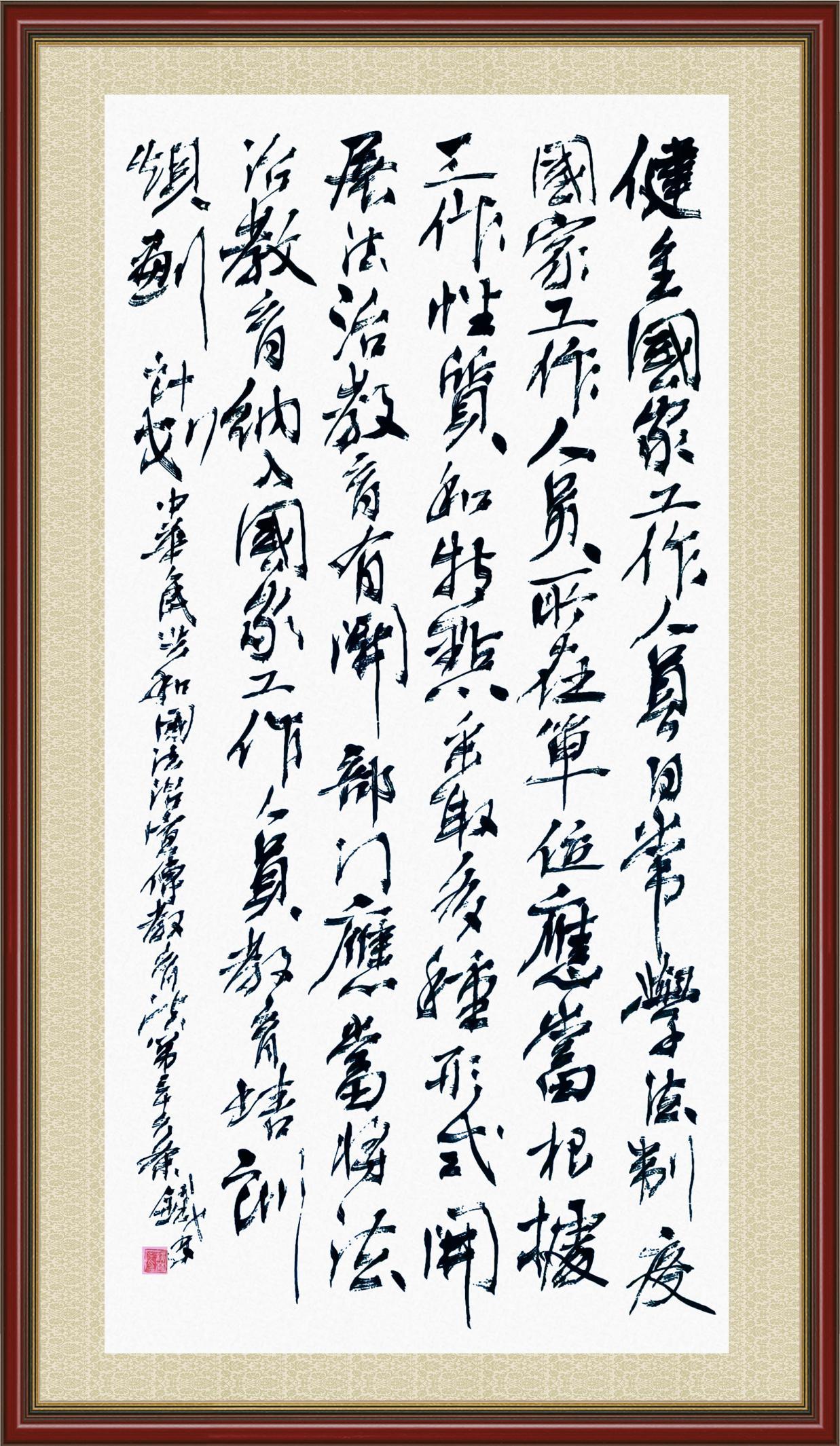 2020年7月11日,由法治日報社主辦的“書·法”系列活動正式啟動,先后書寫《中華人民共和國民法典》《中華人民共和國憲法》《中華人民共和國民營經(jīng)濟促進法》等21部法律法規(guī)。