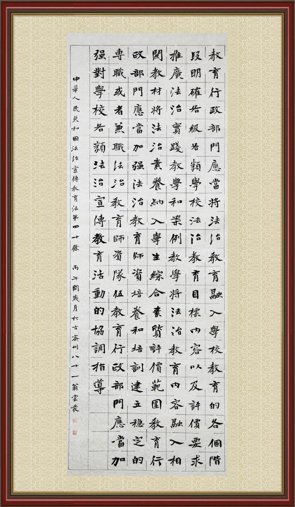 2020年7月11日,由法治日報社主辦的“書·法”系列活動正式啟動,先后書寫《中華人民共和國民法典》《中華人民共和國憲法》《中華人民共和國民營經濟促進法》等21部法律法規(guī)。
