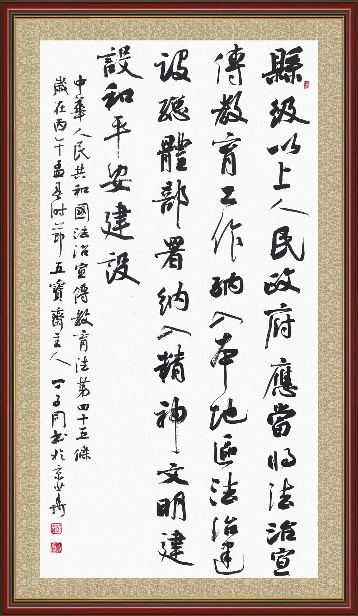 2020年7月11日,由法治日?qǐng)?bào)社主辦的“書·法”系列活動(dòng)正式啟動(dòng),先后書寫《中華人民共和國(guó)民法典》《中華人民共和國(guó)憲法》《中華人民共和國(guó)民營(yíng)經(jīng)濟(jì)促進(jìn)法》等21部法律法規(guī)。